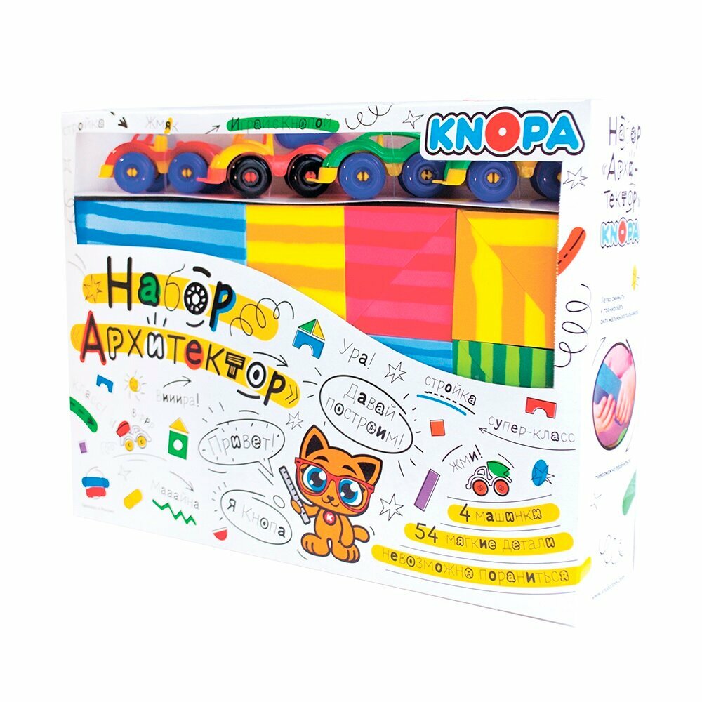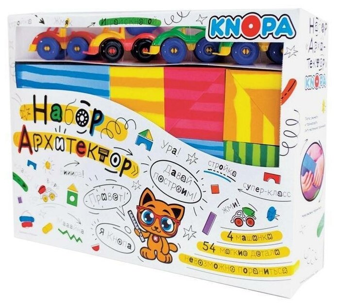 Конструктор Knopa Архитектор 54 элемента 4 машинки. Игровой набор «Архитектор» 54 элемента с 4 машинками замечательный подарок юному фантазеру. Мягкие элементы конструктора разного размера, цвета и форм позволят создать как небольшой малоэтажный городок, так и мегаполис с небоскребами. Детали конструктора, внешне напоминающие дерево, выполнены из легкого и безопасного материала ЭВА – ими невозможно пораниться. Машинки, входящие в набор, позволят населить город и добавить в него движение. Ничто не может ограничить творчество начинающего архитектора.