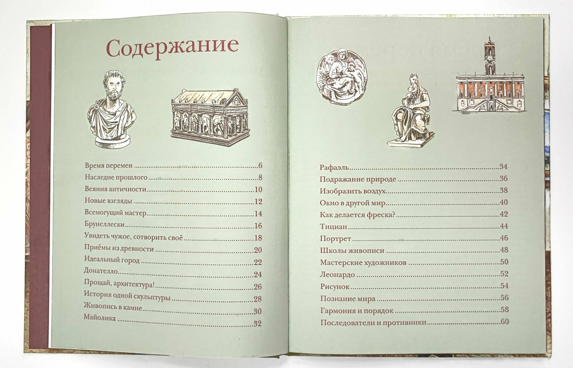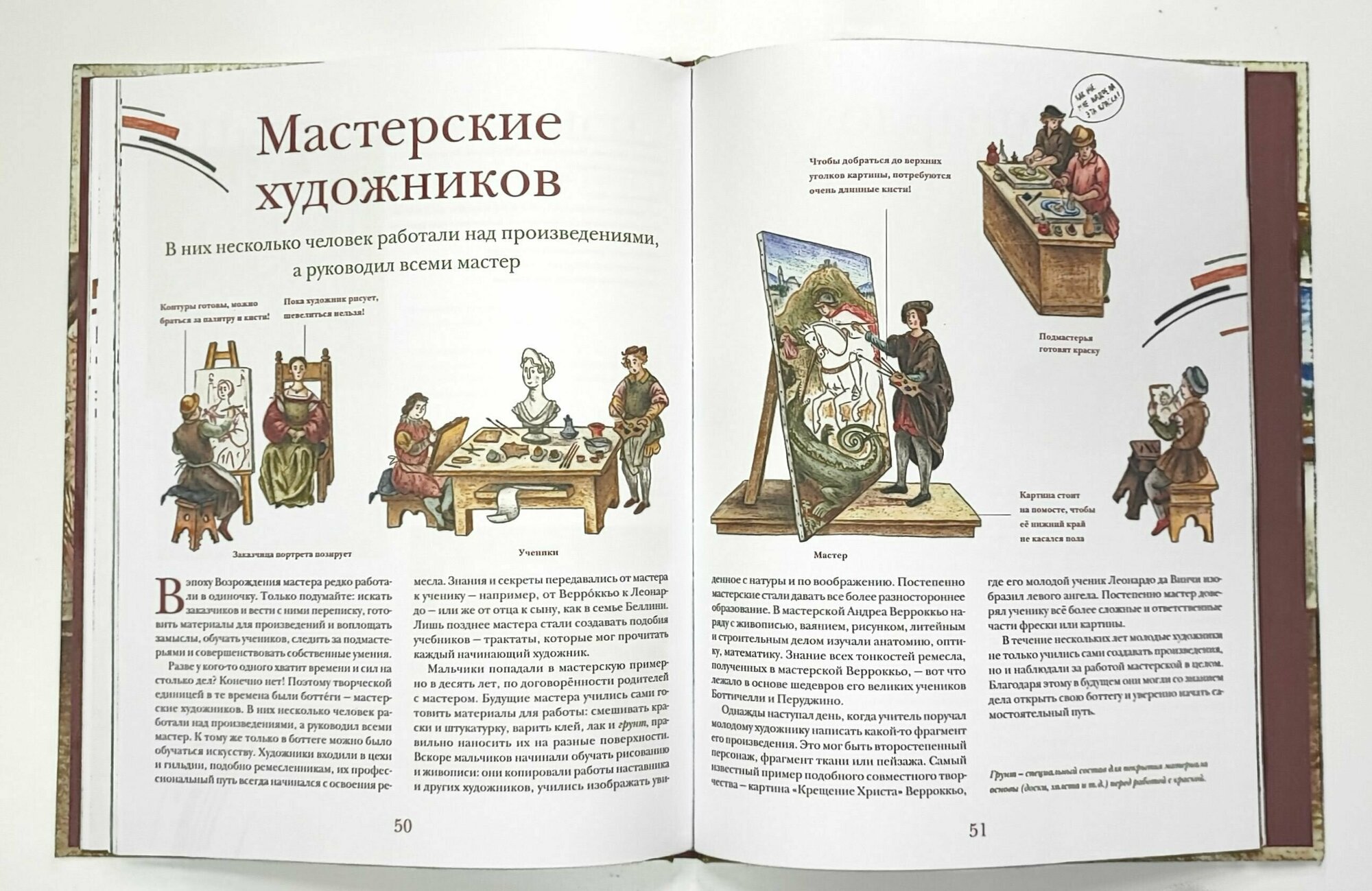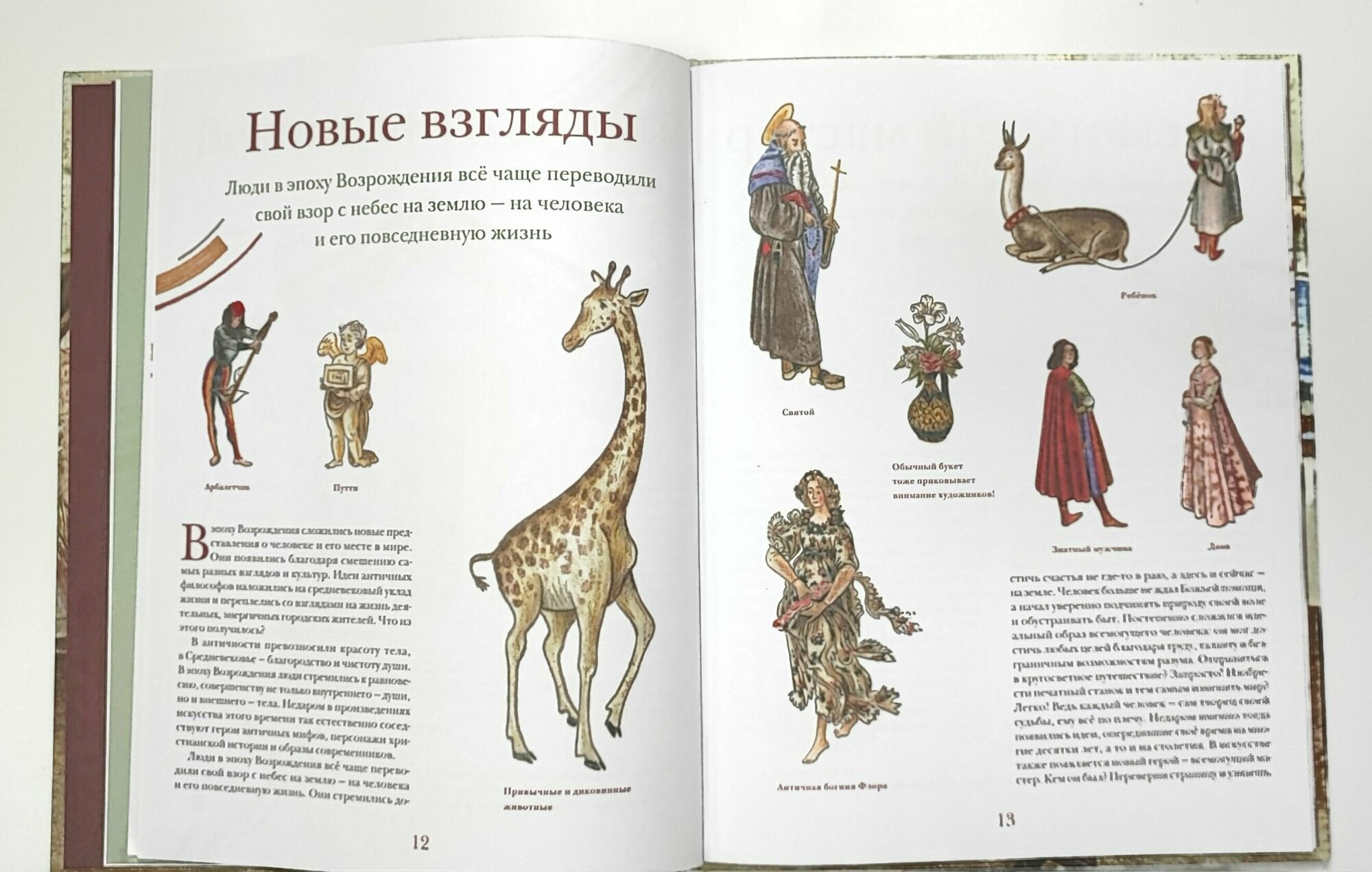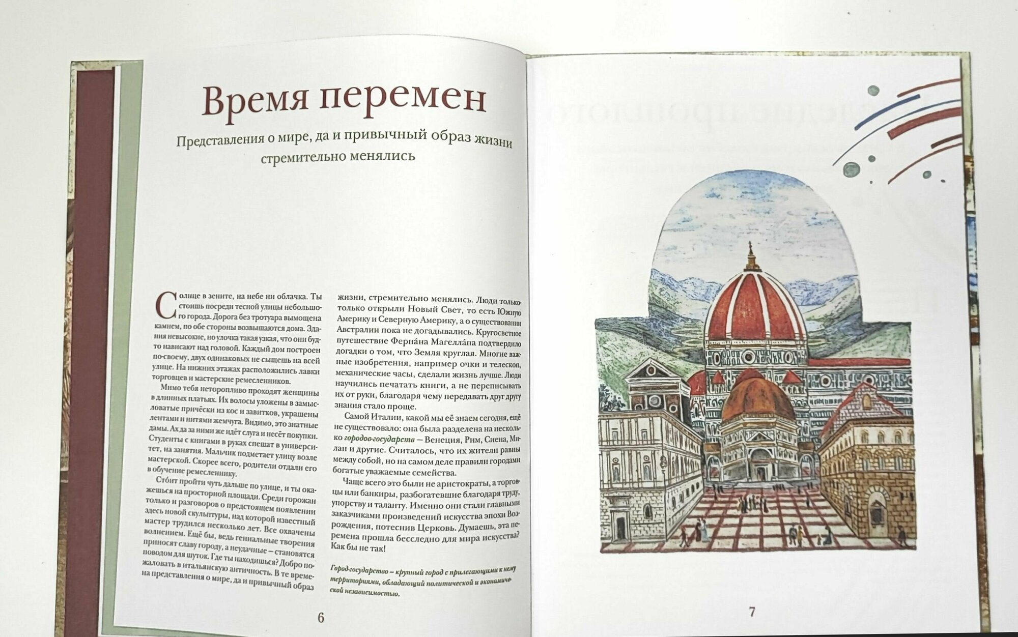 Очень интересно И доступным языком детям об эпохе Возрождения, начиная с описания особенностей жизни и уклада того времени, достижений в области архитектуры, скульптуры, живописи, портрета и т.д., и заканчивая конкретными шедеврами. Книга включает так же несколько вкладышей-разворотов с интересными историями из жизни великих людей этой эпохи. Рекомендую всю серию.