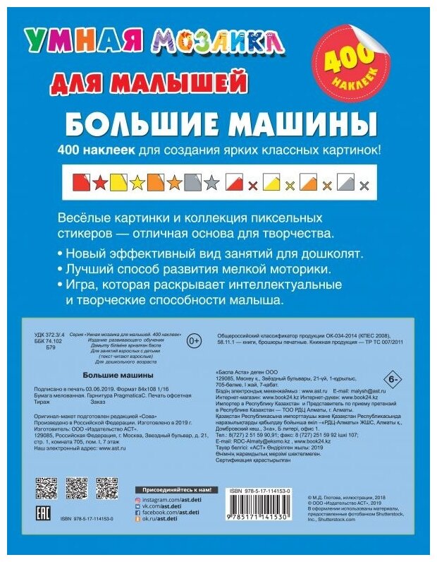 "Большие машины" - это полезная и интересная развивающая книжка-мозаика. Создавая аппликации из цветных геометрических стикеров, ребёнок в игровой форме усваивает понятия "часть" и "целое", развивает мелкую моторику и пространственное мышление, учится усидчивости и внимательности, проявляет творческие и интеллектуальные способности.