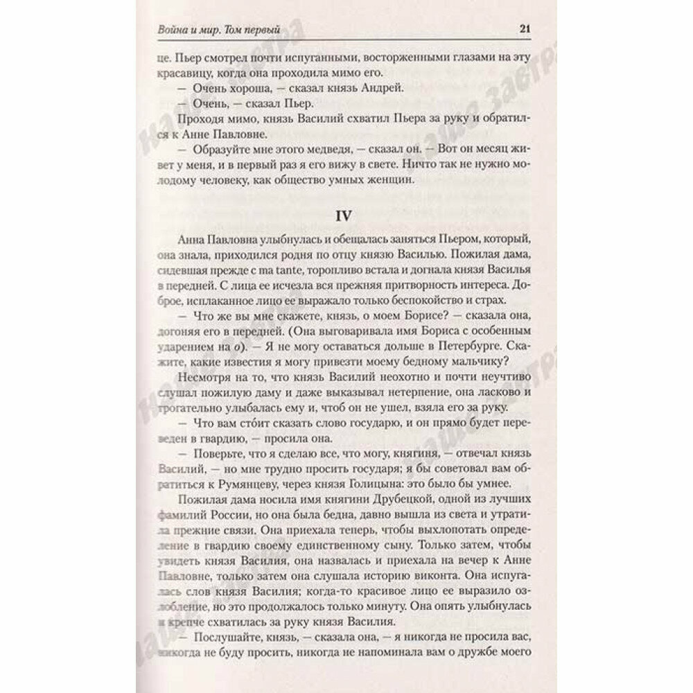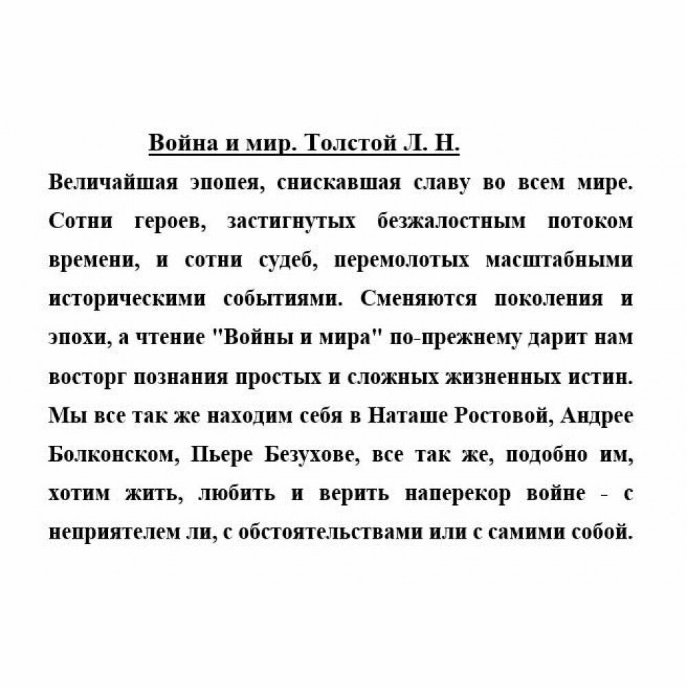 Роман Л.Толстого "Война и мир" изучали в школьной программе. Но в то время до конца прочитать не успела. Решила прочитать уже в более осознанном возрасте. Считаю, что это произведение должно быть в библиотеке у каждого. Что касается самой книги. Книги очень толстая, держать в руках не совсем удобно. Лучше всего читать за столом. Бумага серая, тонкая, шрифт мелкий. Книга была куплена по акции. Сравнительно небольшая стоимость книги соответствует качеству.