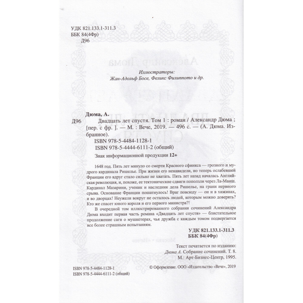 В очередной том иллюстрированного собрания сочинений Александра Дюма входит первая часть романа "Двадцать лет спустя" - блистательное продолжение саги о мушкетерах, чья дружба с каждым томом подвергается все более страшным испытаниям.