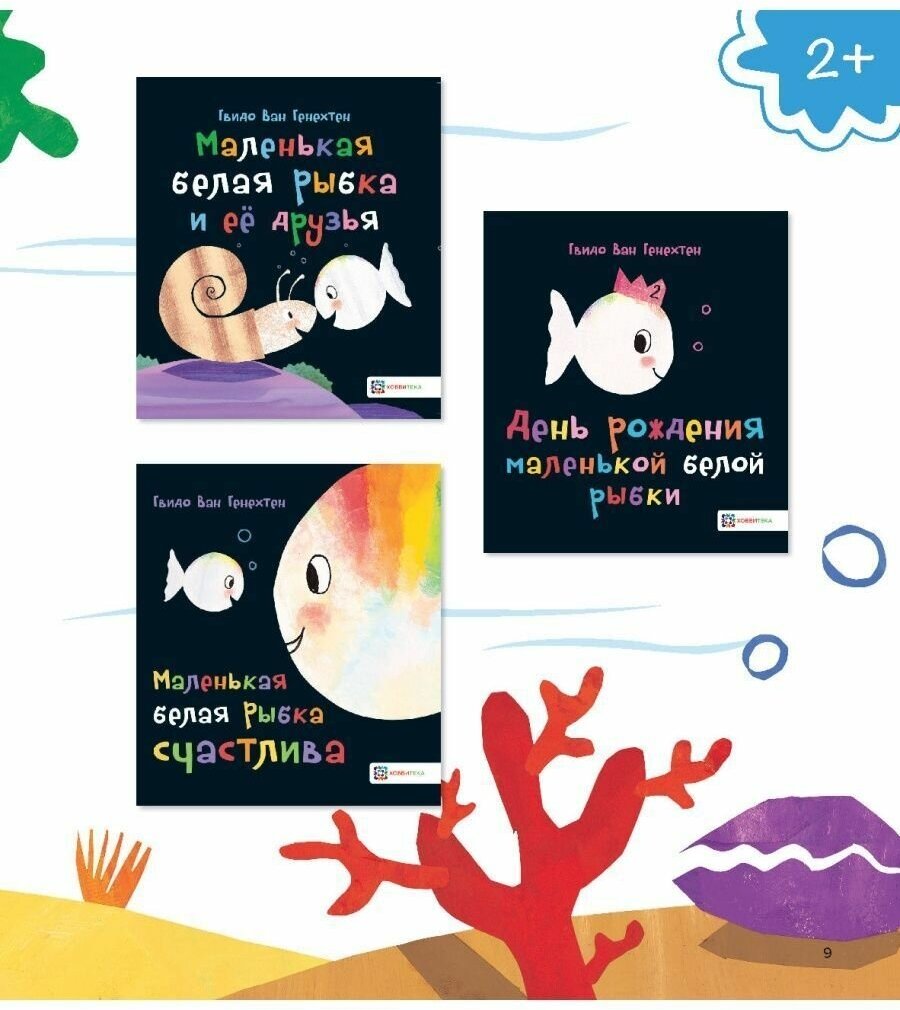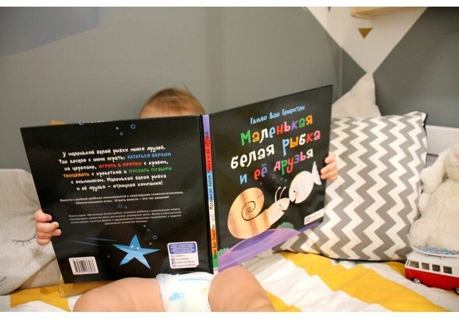 Яркая,веселая книга про белую рыбку и ее друзей. На каждой странице улыбки, игры и танцы всех морских обитателей, поэтому книга у ребёнка вызывает только положительные эмоции радости и веселья. A ещё по ней мы изучаем цвета, потому что на чёрном фоне ни одна яркая рыбка не останется не замеченной )) дочке 2,5 года, я думаю книгу можно начать читать гораздо раньше.