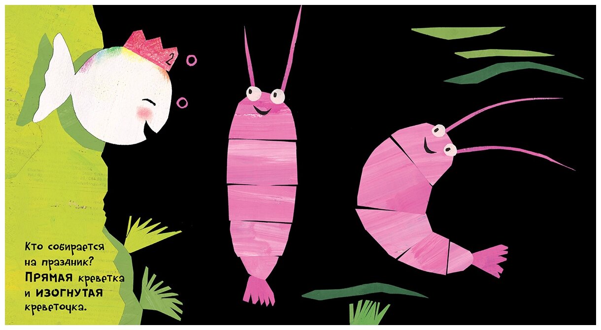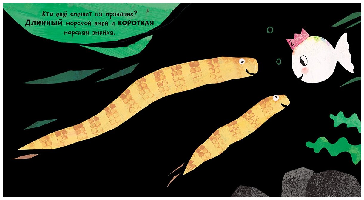 Сегодня у маленькой белой рыбки день рождения, ей исполняется целых два года! По этому случаю рыбка устраивает праздник. А какой же праздник без гостей! Маленький морской ёжик и большой морской ёж, длинный морской змей и короткая морская змейка, грустный дельфин и весёлый дельфинчик – все очень рады приглашению и торопятся поздравить свою подругу! Вместе с рыбкой ребёнок познакомится с противоположностями – в этом ему поможет наглядное изображение, подчеркивающее их значение.