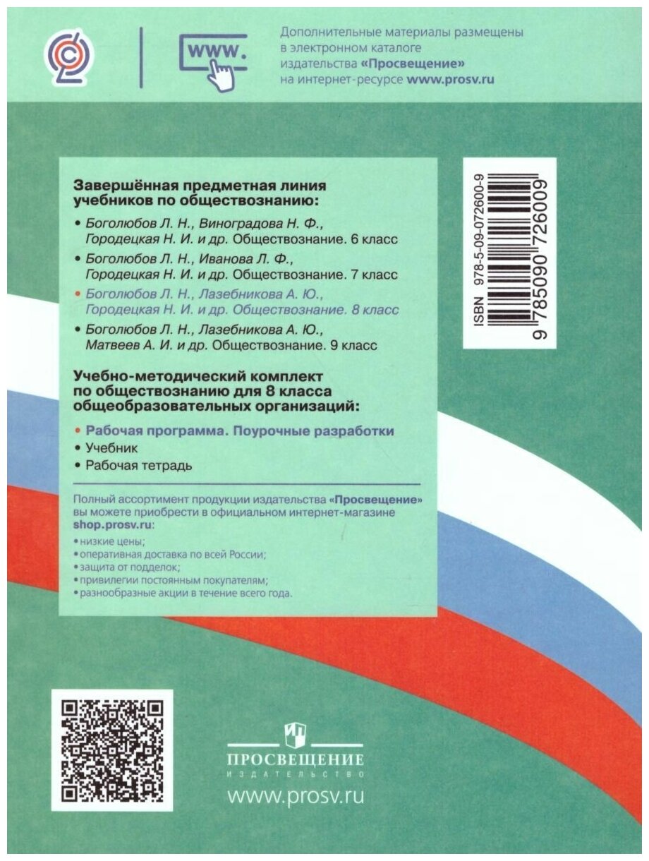 Обществознание. 8 класс. Поурочные разработки. Рабочая программа (Боголюбов Леонид Наумович, Иванова Людмила Фроловна, Городецкая Наталия Ивановна); Просвещение, 2020