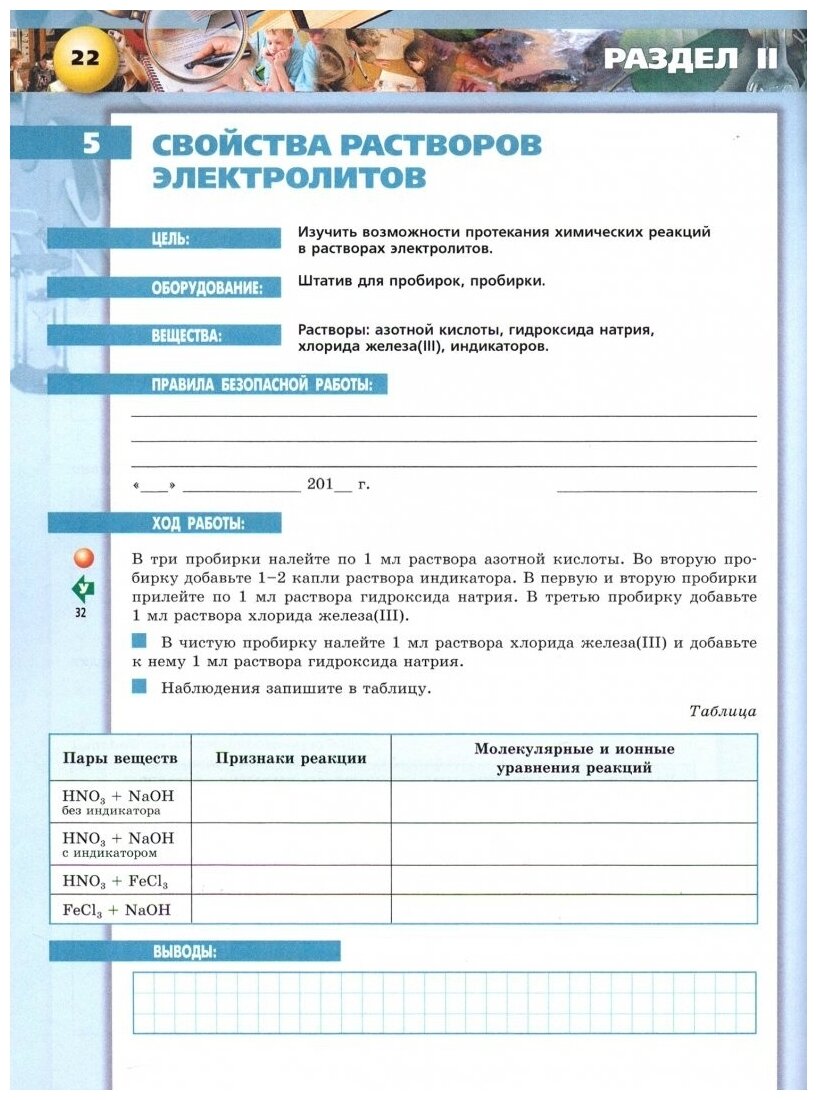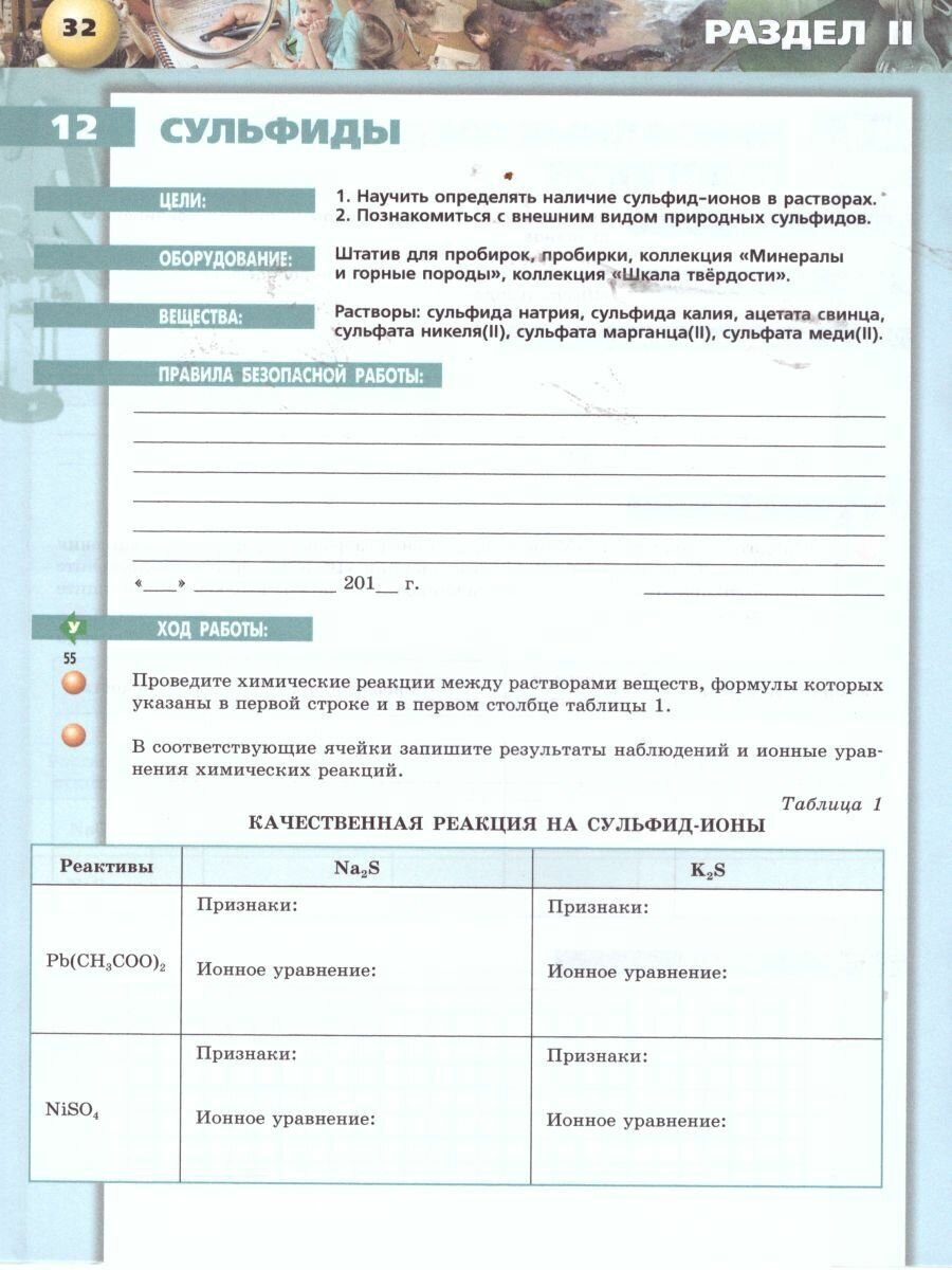 Тетрадь-практикум может быть использована при изучении химии как дополнение к учебно-методическому комплексу другого автора. В тетради представлены практические занятия, лабораторные опыты, экспериментальные задачи. Материал не требует дополнительной доработки. В конце тетради имеется приложение, где представлены качественные реакции на анионы и катионы. Прописана техника безопасности при работе со спиртовкой, пробирками, веществами, а также медицинская помощь при отравлениях и ожогах.
