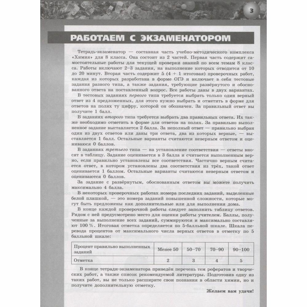 Тетрадь-экзаменатор - составная часть учебно-методического комплекса "Химия" для 8 класса. Она состоит из 2 частей. Первая часть содержит самостоятельные работы для текущей проверки знаний по всем темам 8 класса. Работы включают 2-3 задания, на выполнение которых отводится от 10 до 20 минут. Вторая часть содержит 5 (4+1 итоговая) проверочных работ, каждая из которых разработана в форме ОГЭ и включает в себя тестовые задания разного типа, а также задания, требующие развёрнутого и обоснованного ответа на поставленный вопрос. Все работы даны в двух вариантах. В конце пособия приведён перечень возможных тем творческих работ и рефератов с указанием дополнительной литературы.