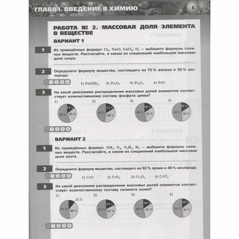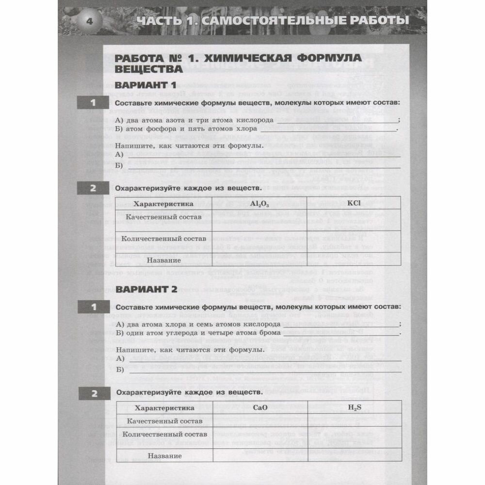 Очень неплохое издание, которое вполне подходит к рабочей программе по учебнику Рудзитиса-Фельдмана. Формат листа тетради - немного меньше листа а4 (то есть копировать можно будет только по одному листу). Хотя, в случае с самостоятельными работами на одном листе приведены задания сразу двух вариантов. Задания подобраны разнообразные: тестовые вопросы, задания типа "вписать название", короткие расчётные задачи, описание элемента по приведенному плану, характеристика способа получения вещества по рисунку, задание на выявление общих свойств, дозаполнить таблицу, вопросы по диаграммам, вопросы со свободным ответом типа "Как вы думаете...". Неплохое подспорье в работе учителя химии.