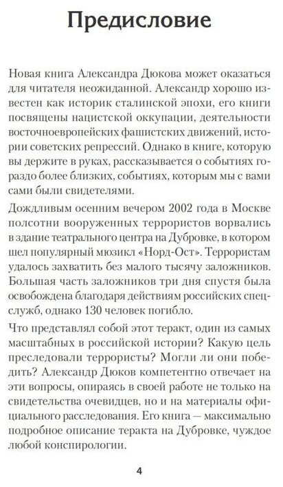 Дождливым осенним вечером 2002 года в Москве полсотни вооруженных террористов ворвались в здание театрального центра на Дубровке, в котором шел популярный мюзикл "Норд-Ост". Им удалось захватить без малого тысячу заложников. Что представлял собой этот теракт, один из самых масштабных в российской истории? Какую цель преследовали террористы? Могли ли они победить? Александр Дюков компетентно отвечает на эти вопросы, опираясь в своей работе не только на свидетельства очевидцев, но и на материалы официального расследования. Его книга - максимально подробное описание теракта на Дубровке, чуждое любой конспирологии.