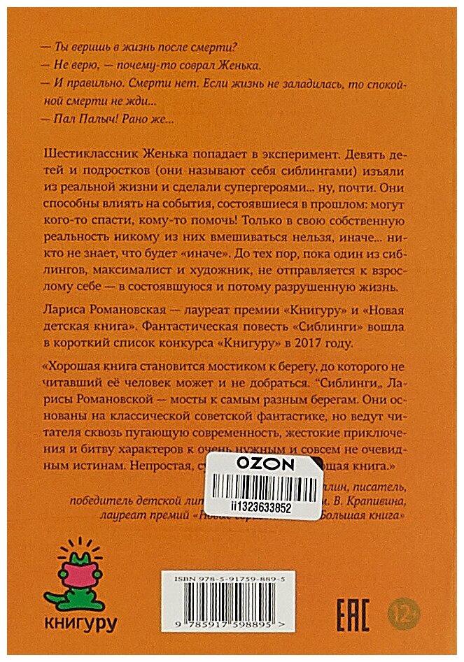Лариса Романовская - лауреат премии "Книгуру" и "Новая детская книга". Фантастическая повесть "Сиблинги" вошла в короткий список конкурса "Книгуру" в 2017 году.