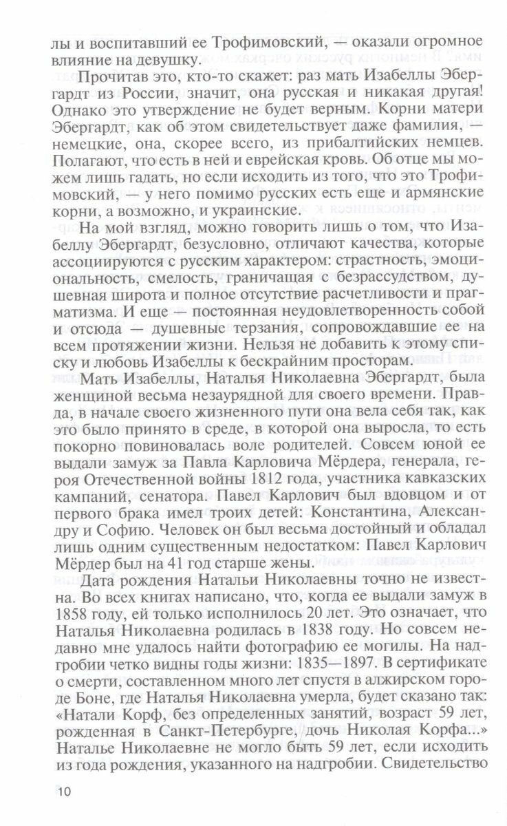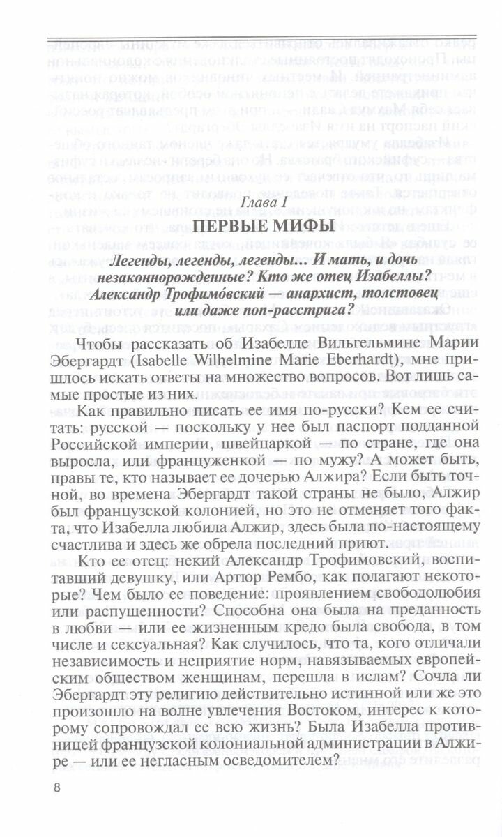 отказалась от веры предков перешла в ислам, ..По сути Изабелла странник по жизни без корней , без семьи , без друзей. Такой была Изабелла Эбергардт, ее жизнь как авантюрный роман. В целом книга мне очень понравилась прочитала ее быстро . Было интересно и любопытно.