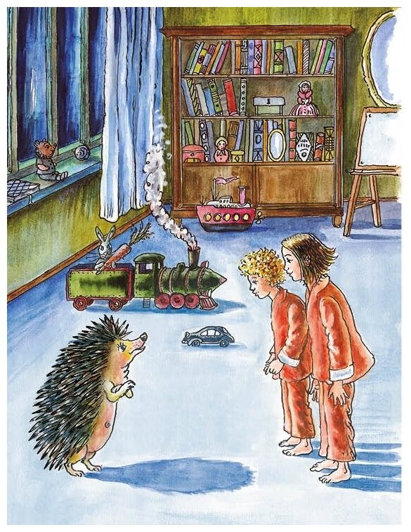 Картинки ребенка завораживают, особенно с ёжиком и месяцем. Долго рассматривали и обсуждали. Потом еще раз возвращались, рассматривали и опять обсуждали. Истории с приятным юмором в диалогах. Колоритные персонажи, особенно воспитательницы. Тема выезда на летнюю дачу вместе с детским садом вызвала у ребенка живейшее любопытство.