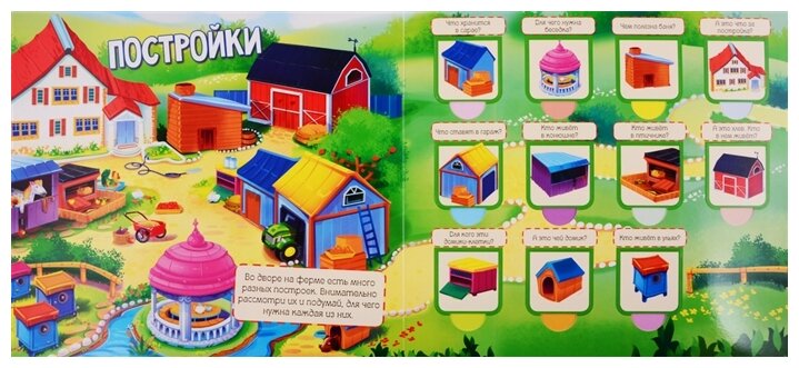 Хорошая книжка. Можно сказать, что образовательная. В игровой форме ребенок изучает устройство фермы. Книжка легкая, компактная, удобная для ребенка. Текста не так много, зато картинки занимают больше всего места. А также волшебные окошки, за которыми кроются ответы на вопросы, которые задают ребенку авторы.