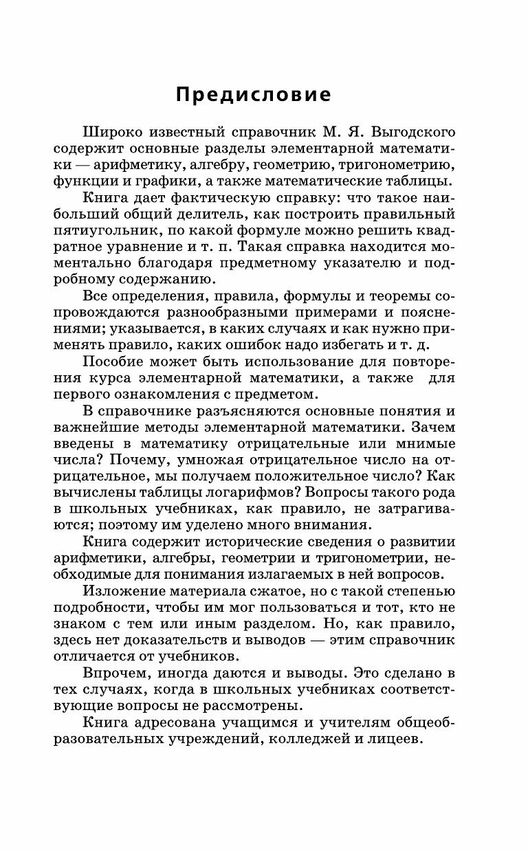 Справочник содержит все определения, правила, формулы и теоремы элементарной математики, а также математические таблицы. Предметный указатель и подробное содержание позволяют легко и быстро получать необходимую информацию.