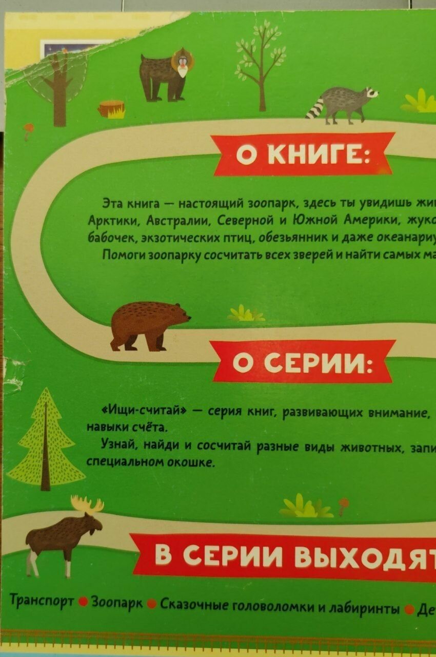 Развивает внимание, навыки счета, усидчивость. Картинки яркие, симпатичные. Животные узнаваемые. Удобный переплет (у нас прошито нитками), качественная печать на хорошей бумаге.
