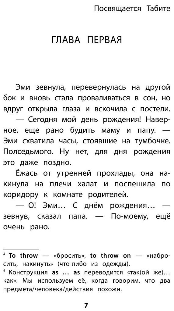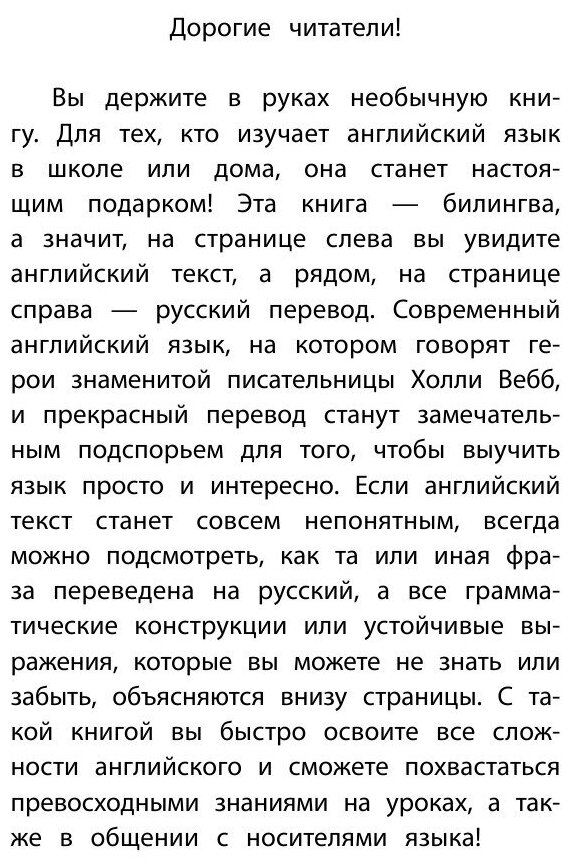 .В этой книге-билингве русский перевод расположен напротив английского текста, так что следить за сюжетом будет легко. Интересные обороты и сложные грамматические конструкции поясняются в постраничных сносках-комментариях. С любимыми историями английский изучать легко и интересно!