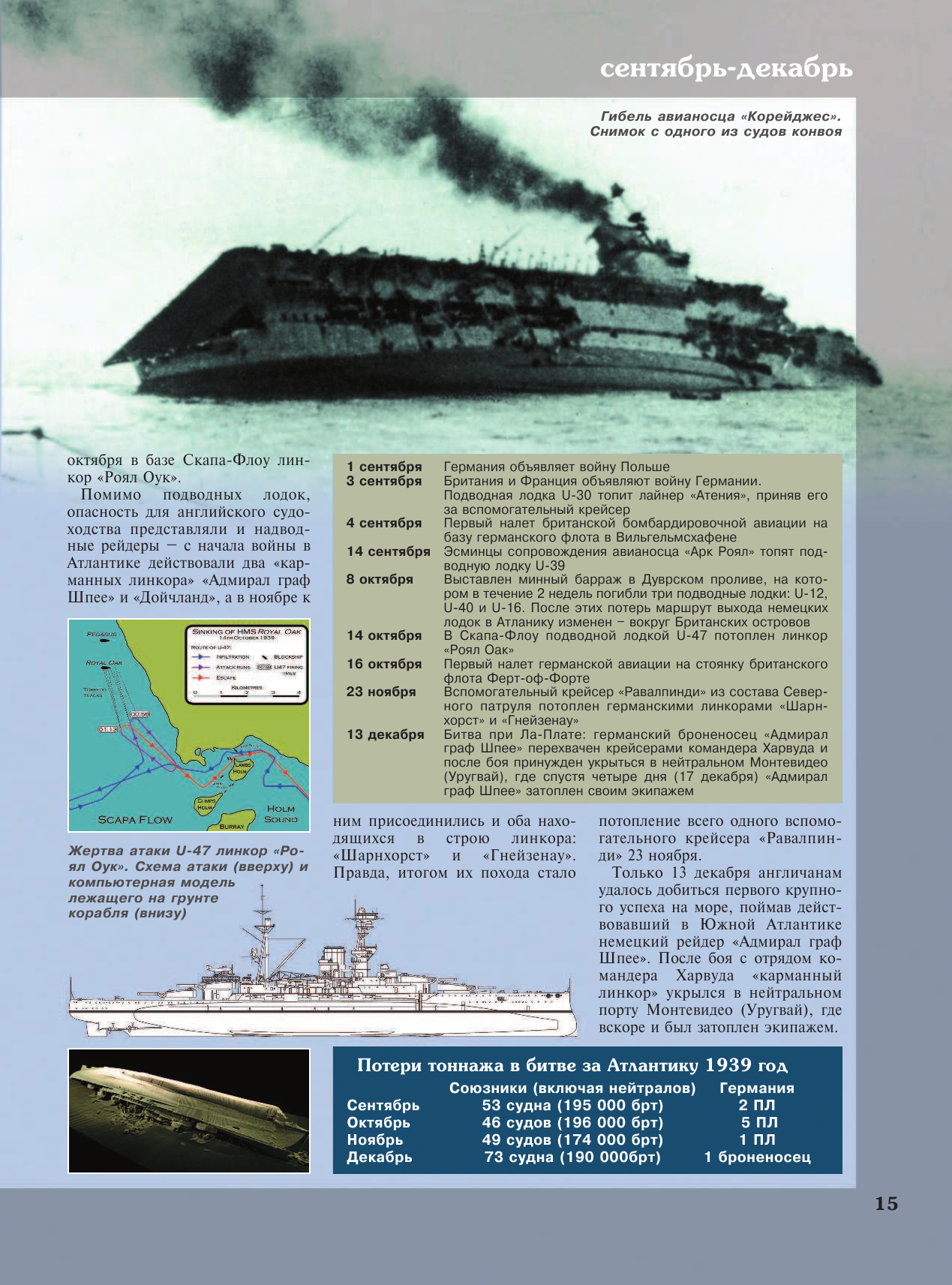 Уже 14 октября 1939 г. немецкая подводная лодка смогла прямо в базе потопить английский линкор "Ройял Оук", а 13 декабря 1939 г. у берегов Аргентины развернулось одно из первых морских сражений Второй мировой войны, в результате которой был потоплен немецкий крейсер "Адмирал граф Шпее". С вступление в войну Японии боевые действия охватили и Тихий океан.