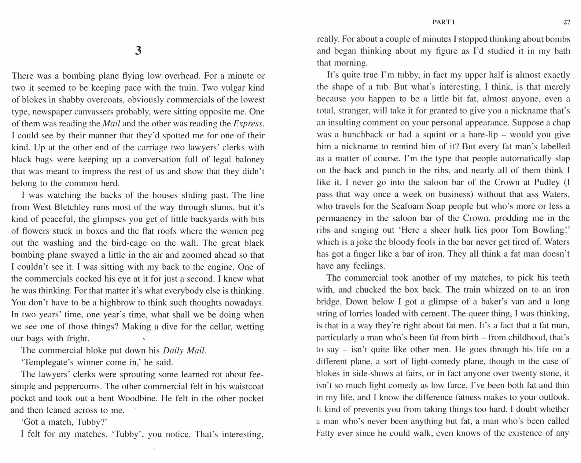 Insurance salesman George Bowling takes a day off work to pick up a new set of teeth. He's had a win at the races. Life should be grand. But he is stuck in a rut - portly, middle aged, with a wife and children in the suburbs - and this morning he forgot to wash the soap off his neck.