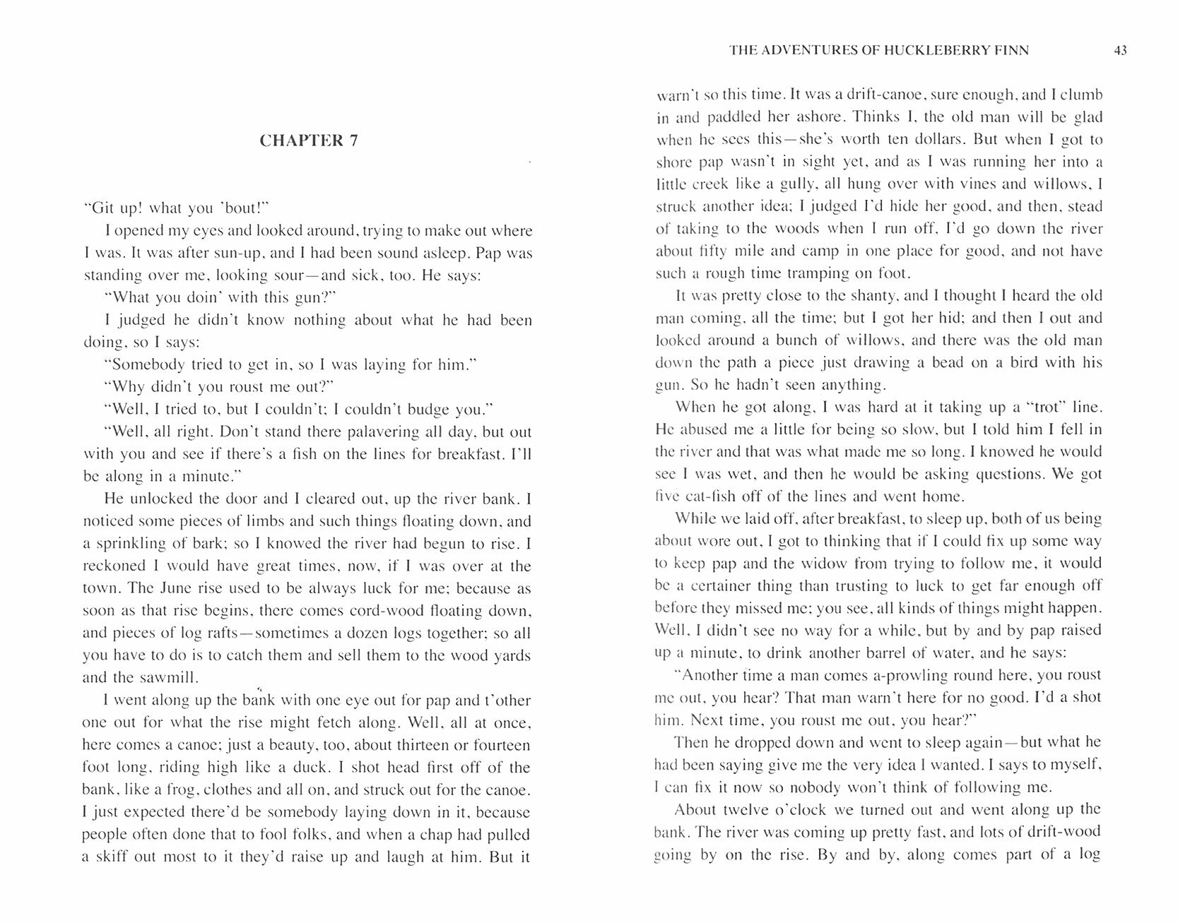 Отличная, доступная и удобная книга для изучения английского языка. Марк Твен пишет просто и понятно, но в то же время его писательский талант гарантирует вам интересный текст, от которого не станет скучно. Описание главного героя, юного Гекльберри Финна, вызывает неподдельное восхищение. Он совсем не похож на типичного героя, с которыми мы обычно сталкиваемся в детской и подростковой литературе. Хулиган, вечно бунтующий против добропорядочности и навязываемых ему норм, Гекльберри Финн стал своего рода символом освобождения от социальных оков. Через него Твен изображает картину морального состояния американского юга той эпохи. Мне очень понравилось это произведения и я могу рекомендовать его для чтения с детьми, потому что оно учит быть терпимым, но в то же время прививает способность постоять за себя.