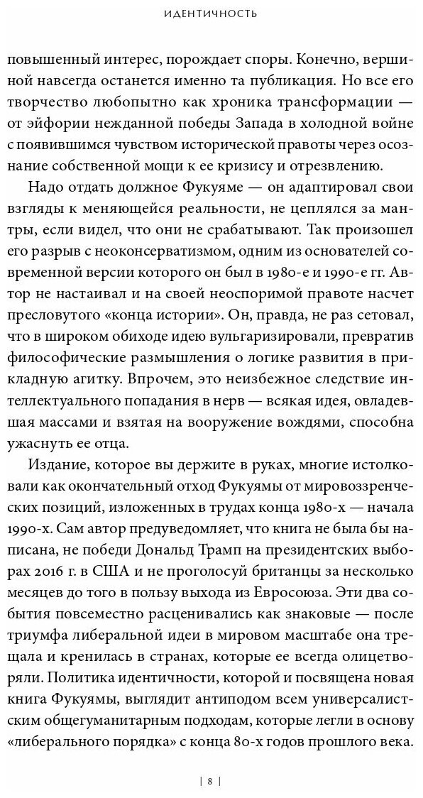 В последние годы все больше и больше внимания люди во всем мире начинают уделять своей идентичности — национальной, расовой, гендерной, религиозной. Этот глобальный тренд, по мнению Фрэнсиса Фукуямы, автора бестселлера «Конец истории и последний человек», является решающим фактором для эффективной работы общественного механизма, будь то в странах Востока, Юго-Восточной Азии, Соединенных Штатах или Скандинавии. В своей новой книге Фукуяма исследует истоки нашего стремления к признанию достоинства и разбирает последствия влияния политики идентичности на либеральный миропорядок в эпоху популизма. Задача, которую ставит перед собой Фукуяма, — доказать, что права личности, лежащие в основе либеральной идеи, не только могут вести к индивидуалистическому дроблению обществ, но и создать основу для социальной консолидации.