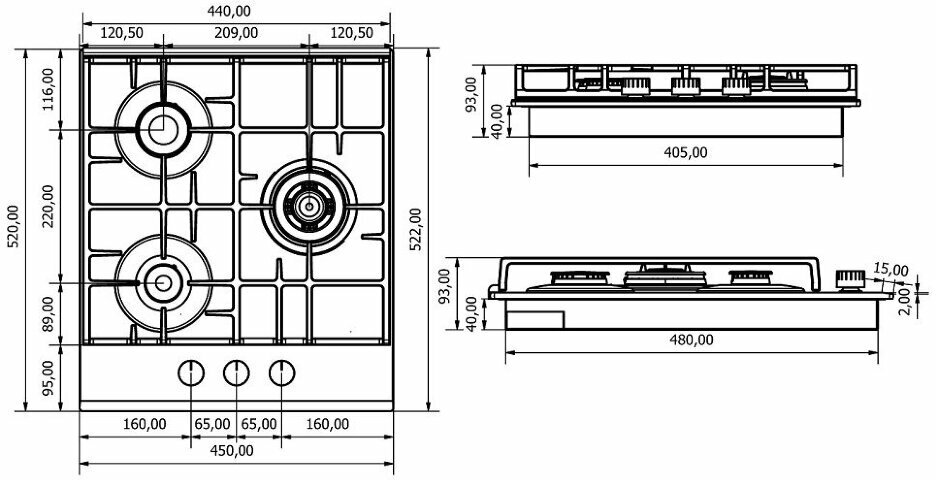 | Дополнительно | три газовые конфорки передняя левая 1 кВт, задняя левая 1.75 кВт, средняя левая WOK 2.5 кВт |