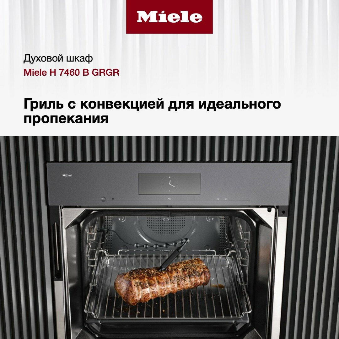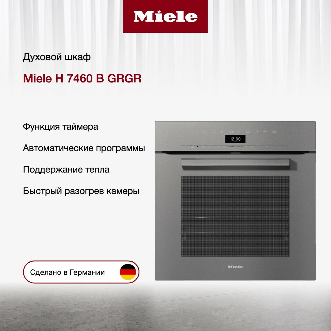 Духовой шкаф Miele H 7460 B GRGR выполнен в привлекательном цвете «графитовый серый». Он подчёркивает нестандартность и в то же время элегантность устройства. При этом функциональность тоже на высоте. Четырёхстрочный сенсорный дисплей с текстовыми подсказками DirectSensor отвечает за доступность навигации. Дистанционное управление и контроль происходят с помощью приложения Miele@mobile, установленного на планшет или смартфон.Основные сведенияВ Миле H 7460 B GRGR можно выбрать любой из 9 режимов нагрева. Кроме различных видов жара, гриля и конвекции. Есть возможность добавления пара, что позволяет блюду стать сочнее и румянее. А автоматика жарения создана для запекания мяса. Она сначала выставляет высокую температуру, а затем низкую, чтобы запекаемый кусок получился хрустящим снаружи и нежным внутри.ОсобенностиДля тех, кто не хочет возиться с настройками, в духовке присутствуют автоматические программы с уже выставленными параметрами. Также в память умного прибора вы сможете внести до 20 своих рецептов.Опция TasteControl после приготовления пищи и отключения аппарата снижает нагрев в рабочей камере, чтобы избежать чрезмерной тепловой обработки пищи.