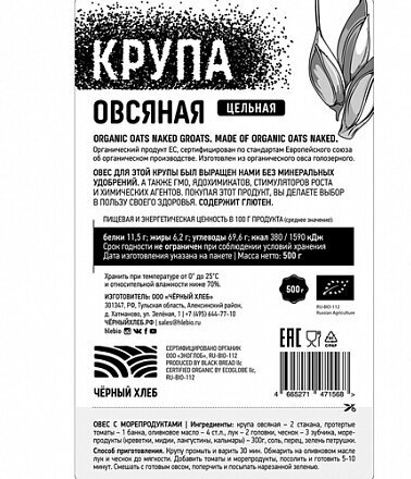 Крупа овсяная Черный хлеб BIO цельная это великолепный источник витаминов, микроэлементов, аминокислот, антиоксидантов и, конечно, любимого с детства вкуса! Из цельной овсяной крупы можно приготовить не только ароматные и сытные каши, но и великолепное печенье, запеканки, десерты и даже супы! Овсяная крупа от компании Черный хлеб это цельные зерна голозерного овса, выращенного без применения какой бы то ни было химии: усилителей роста, пестицидов, гербицидов и др. Овсяная крупа служит источником медленно усваиваемых углеводов: она прекрасно насыщает и дает организму энергию на протяжении многих часов, поэтому овсянка Черный хлеб будет интересна людям, которые занимаются спортом и контролируют собственный вес. Варка цельного овсяного зерна занимает 3040 минут.