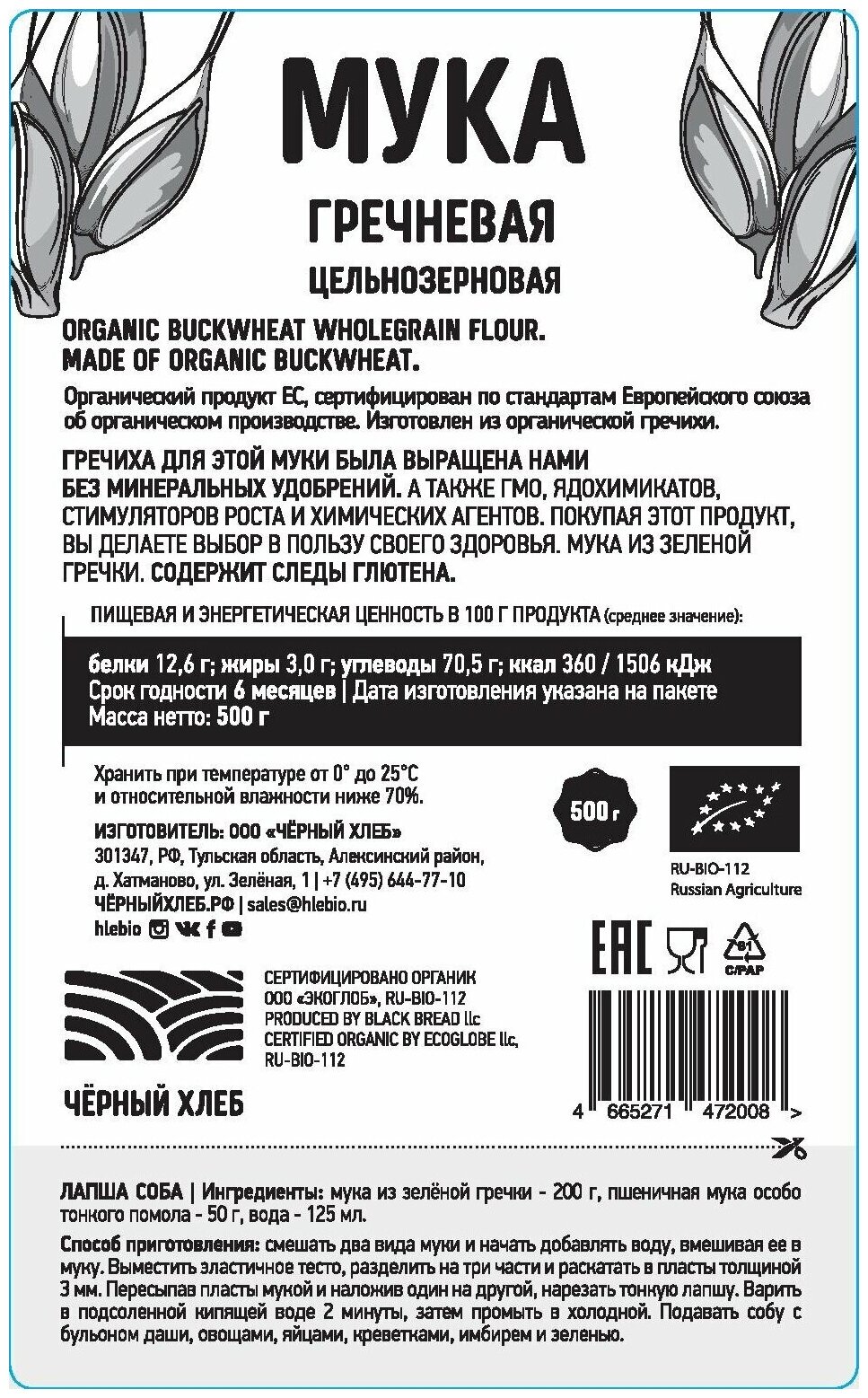 Гречневая цельнозерновая мука Чёрный хлеб это уникальный продукт, богатый минералами, витаминами, клетчаткой и не подвергнутый термической обработке. Мука из зелёной гречки популярна среди поклонников здорового питания во всём мире. Американцы пекут из нее традиционные брауни и маффины, итальянцы делают пасту canederli и pizzoccheri, французы фруктовые пироги. На Руси из смеси пшеничной и гречишной муки готовили блины и оладьи, вареники и галушки, а в Азии уже много веков делают лапшу соба.