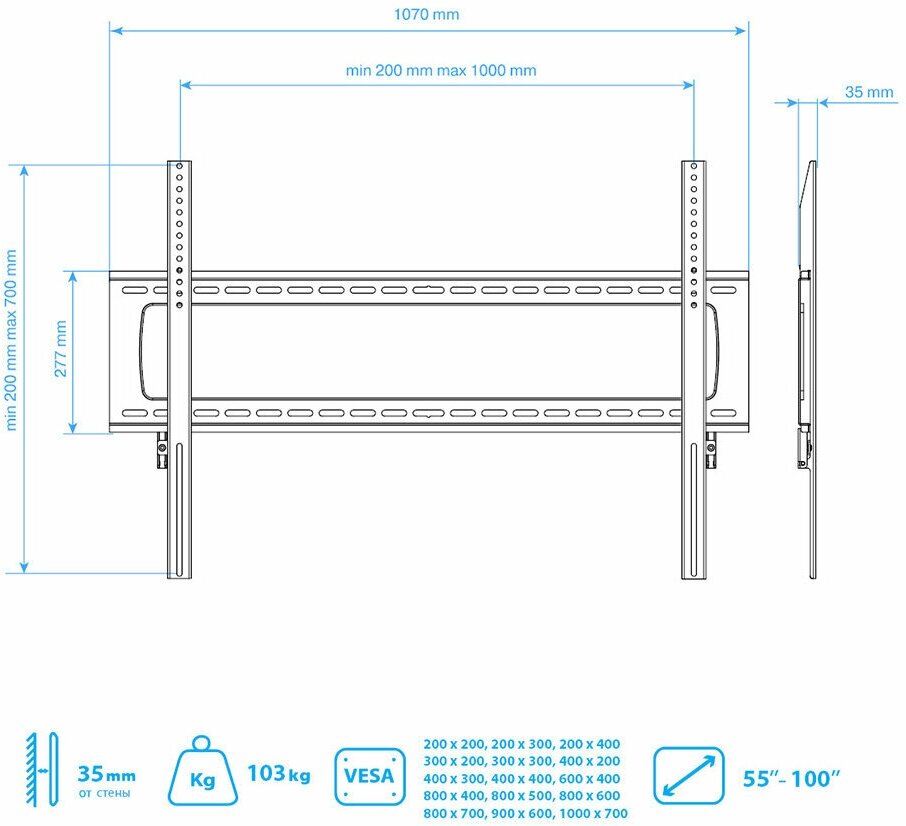 | Особенности | минимальная диагональ ТВ 55", расстояние от стены 35 мм, встроенный уровень |