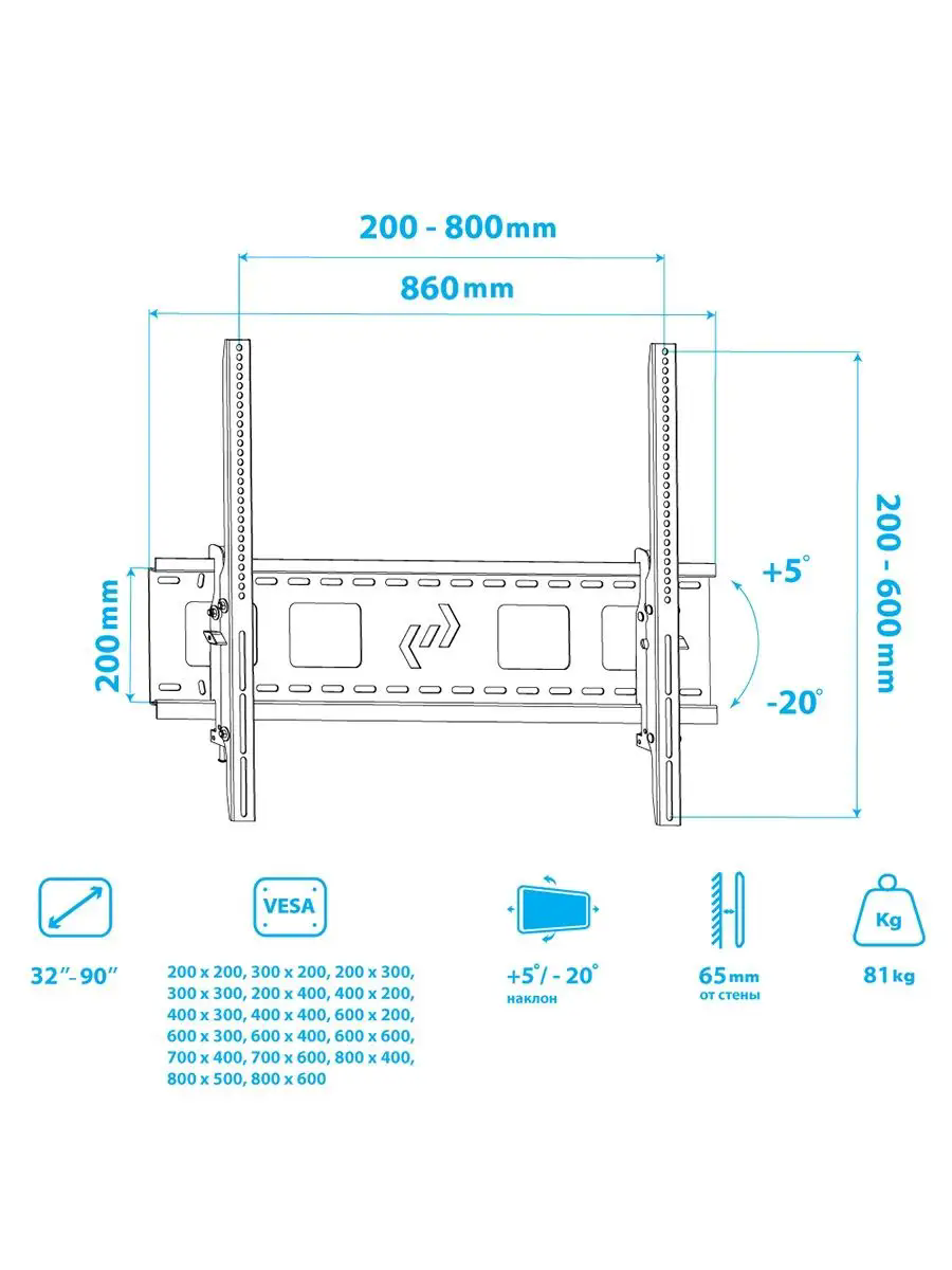 | Особенности | Широкое настенное основание с увеличенными размерами, Простая установка при помощи водяного уровня, Настенное основание кронштейна можно выровнять по горизонту благодаря крепежным отверстиям специальной формы |