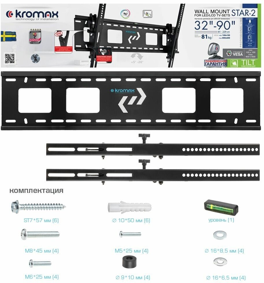 - Мощный, лёгкий монтаж, уровень в комплекте, универсальный набор винтов крепления.