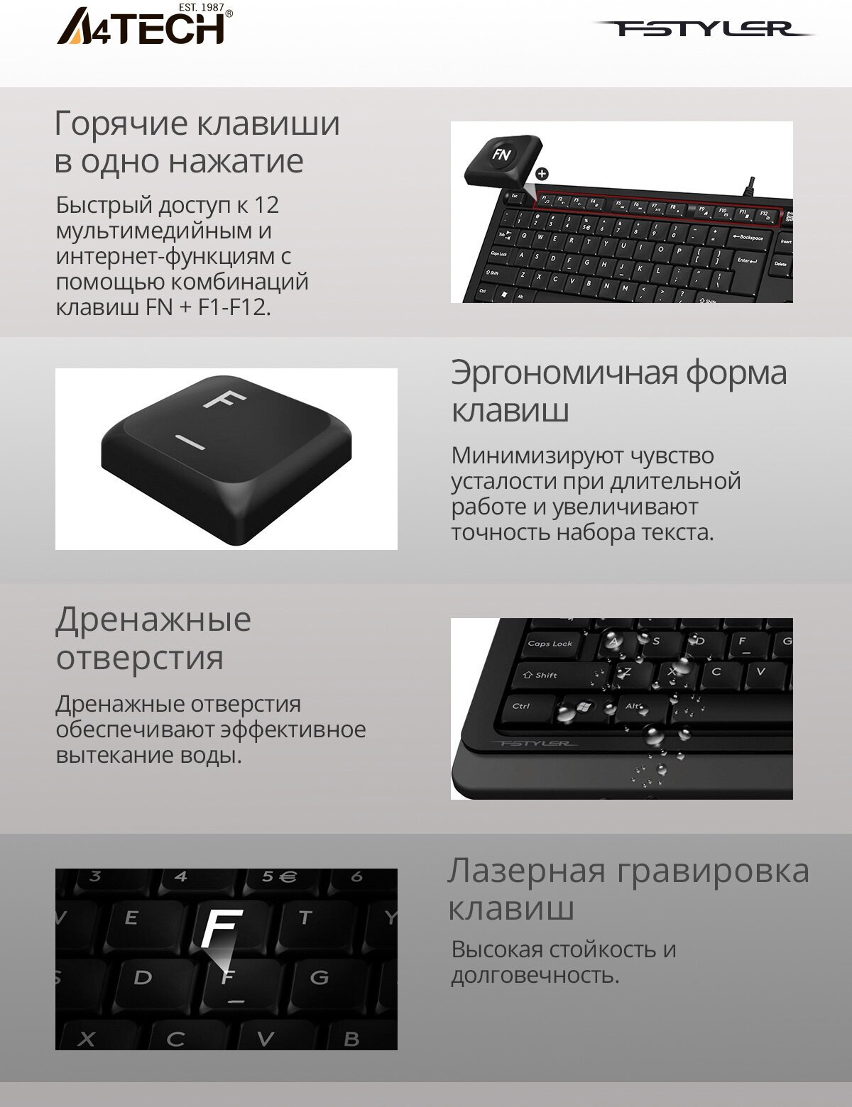 Проводная клавиатура A4Tech FStyler FK10 обеспечит комфортный набор текста во время работы или учёбы. Низкопрофильные мягкие кнопки быстро откликаются на прикосновение пальцев, не издают громких звуков. удобно Устройство снабжено 104 стандартными клавишами и 12 для быстрого доступа к мультимедийным функциям. К компьютеру аксессуар подключается через порт USB 2.0. Длина кабеля 1,5 м позволит максимально удобно расположить клавиатуру на столе. безопасно Корпус устройства изготовлен из прочного АБС-пластика, обеспечивающего его устойчивость к механическим повреждениям и длительный срок службы. Конструкция надёжно защищена от попадания воды внутрь. Если вы случайно прольёте на клавиатуру жидкость, она вытечет через специальные дренажные отверстия.
