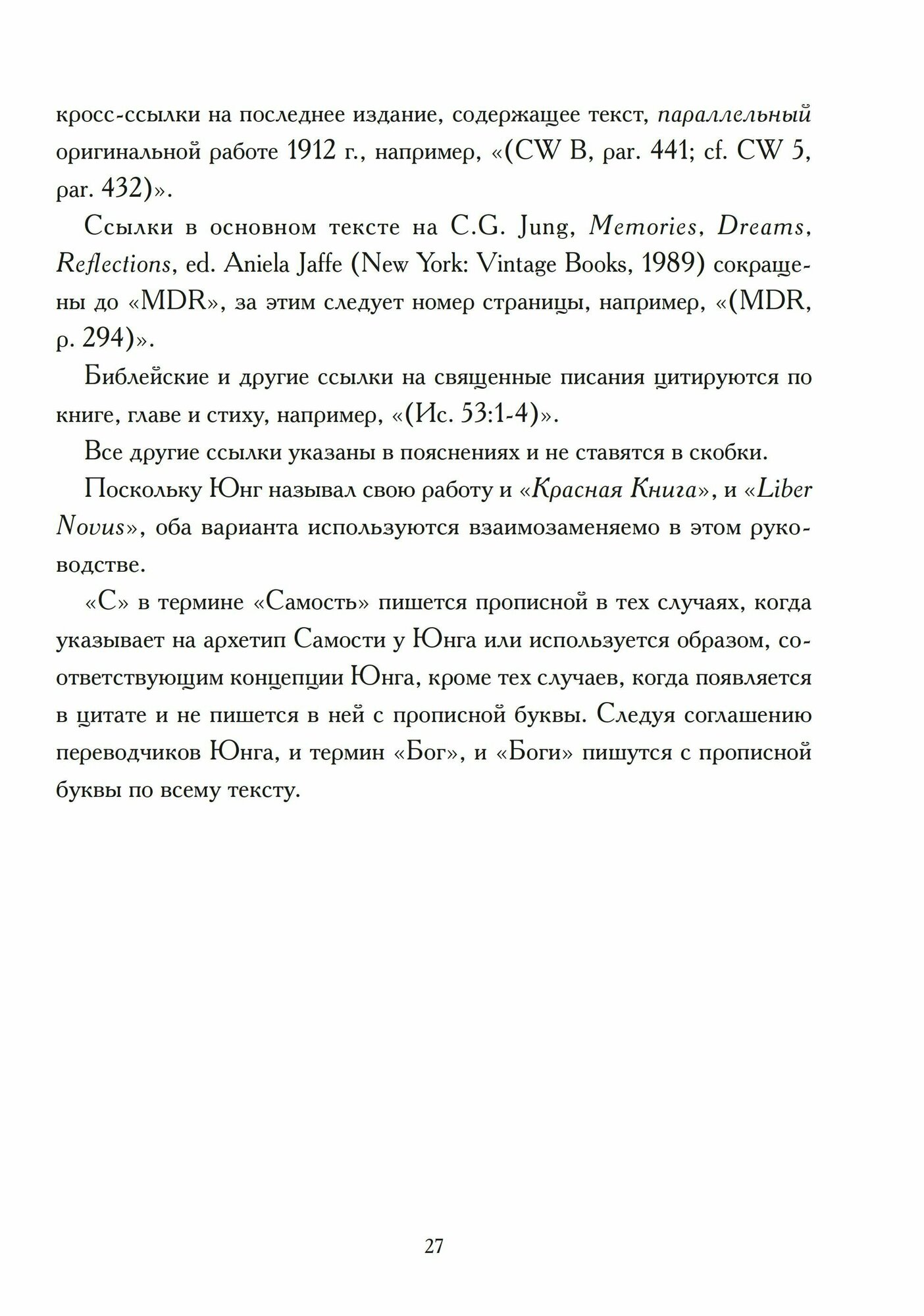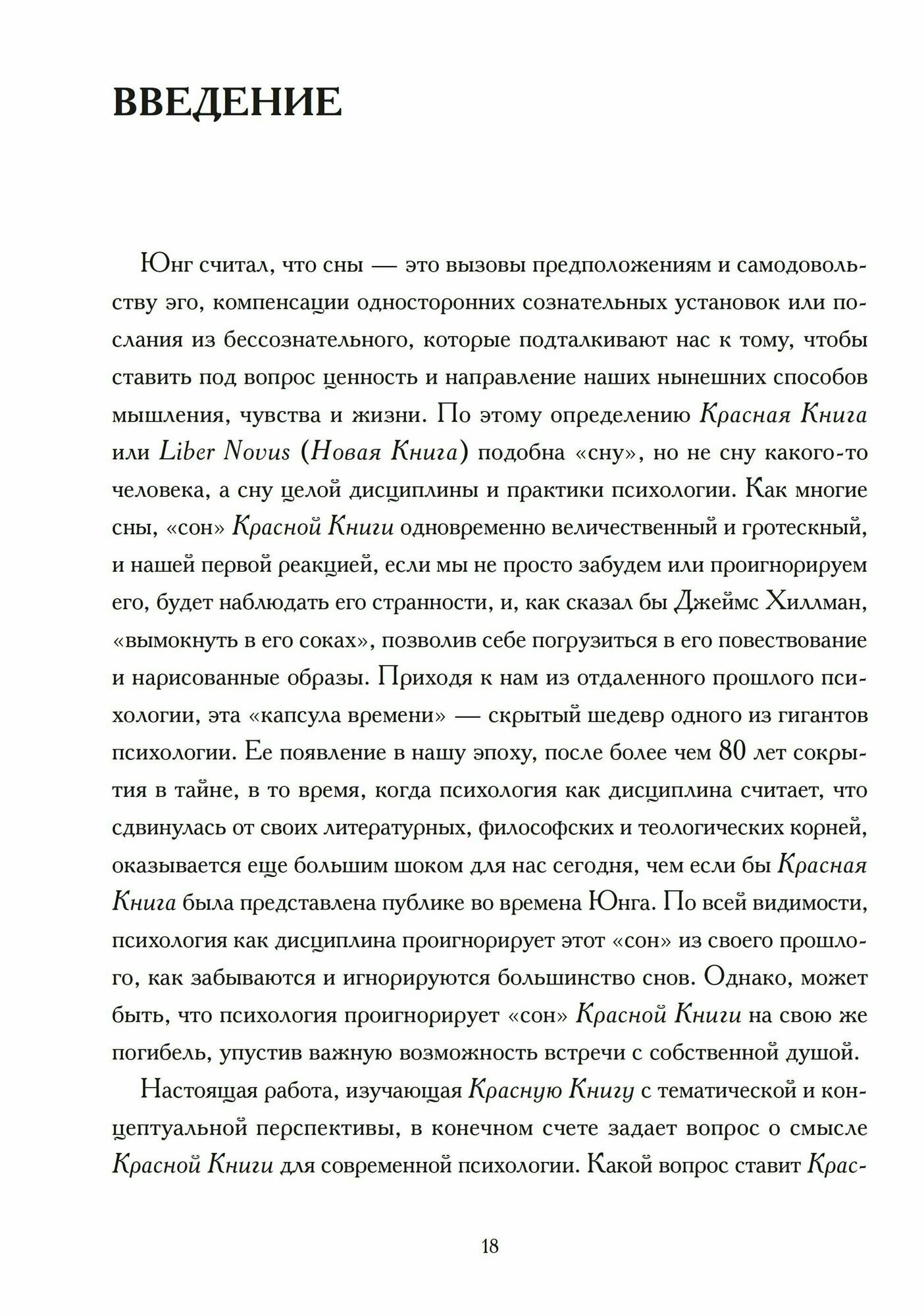 бессознательного, которые подталкивают нас к тому, чтобы ставить под вопрос ценность и направление наших нынешних способов мышления, чувства и жизни. По этому определению Красная Книга или Liber Novus (Новая Книга) подобна «сну», но не сну какого-то человека, а сну целой дисциплины и практики психологии. Как многие сны, «сон» Красной Книги одновременно величественный и гротескный, и нашей первой реакцией, если мы не просто забудем или проигнорируем его, будет наблюдать его странности, и, как сказал бы Джеймс Хиллман, «вымокнуть в его соках», позволив себе погрузиться в его повествование и нарисованные образы. Приходя к нам из отдаленного прошлого психологии, эта «капсула времени» — скрытый шедевр одного из гигантов психологии. Ее появление в нашу эпоху, после более чем 80 лет сокрытия в тайне, в то время, когда психология как дисциплина считает, что сдвинулась от своих литературных, философских и теологических корней, оказывается еще большим шоком для нас сегодня, чем если бы Красная Книга была представлена публике во времена Юнга. По всей видимости, психология как дисциплина проигнорирует этот «сон» из своего прошлого, как забываются и игнорируются большинство снов. Однако, может быть, что психология проигнорирует «сон» Красной Книги на свою же погибель, упустив важную возможность встречи с собственной душой.