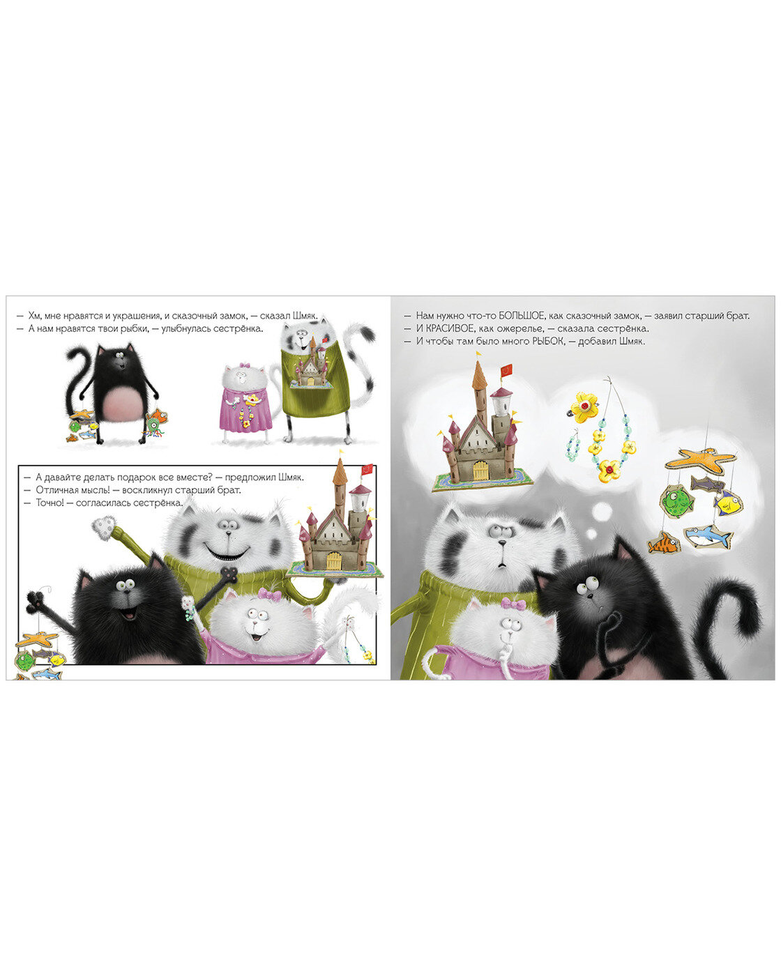Шмяк вместе с братом и сестрой решили порадовать родителей — приготовить для них самодельные подарки. Каждый хотел сделать самый лучший сюрприз, чтобы мама и папа знали, как сильно они их любят! Котята очень старались, но их поделки были одинаково хороши. Что же делать? Как родители смогут выбрать? Идея! Надо сделать один общий подарок! Ура, все получилось… но вот только хитрые чайки все разрушили. Шмяк, его брат и сестра очень расстроились, все их старания прошли даром.