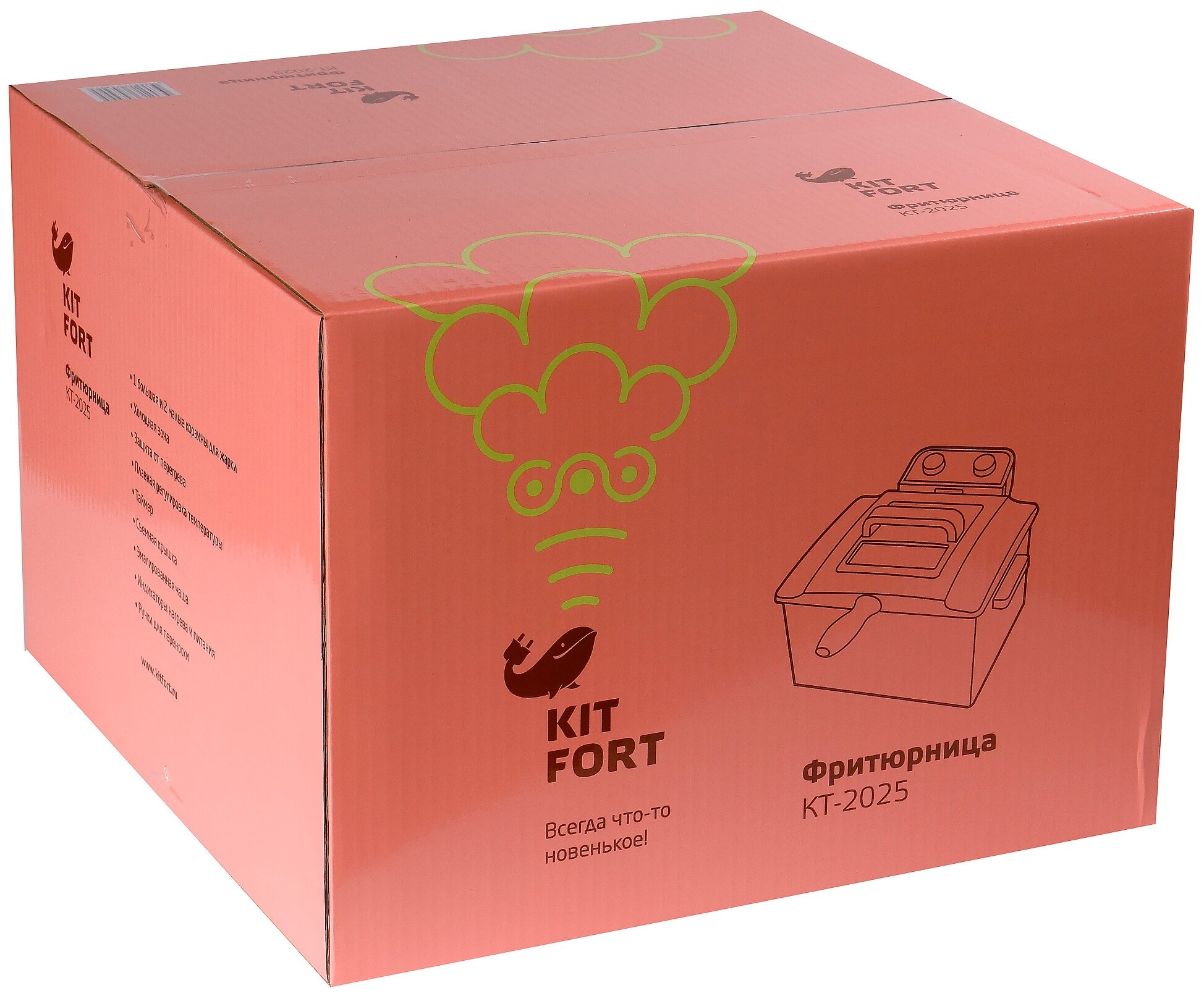 | Прочие особенности и свойства | Kitfort KT-2025 укомплектована тремя корзинами для жарки — одной большой и двумя маленькими.,Малые корзины вы можете устанавливать во фритюрницу одновременно.,Полностью разборная конструкция, удобно мыть.,,Таймер:30 мин,Напряжение:220–240 В, 50/60 Гц,Мощность |