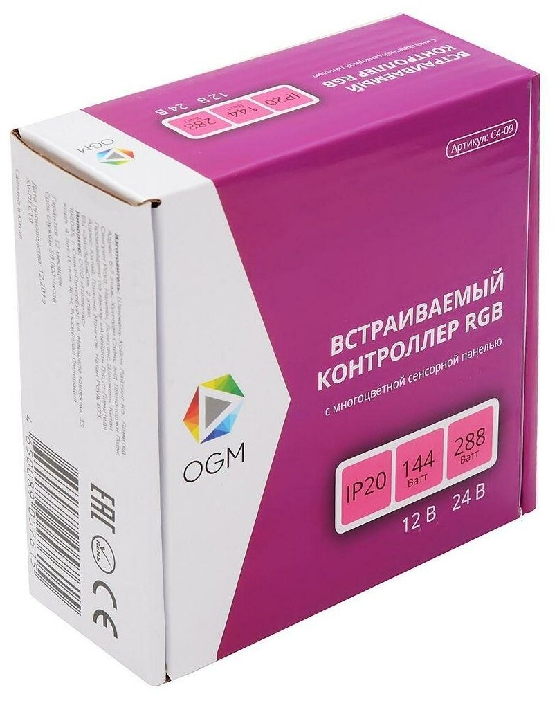 Контроллер RGB 04-09 предназначен для управления многоцветной светодиодной лентой RGB. С помощью него можно регулировать цветовые оттенки, включать или выключать светодиодную ленту, выбирать различные динамические режимы свечения светодиодной ленты, регулировать яркость, а также подобрать комфортную скорость смены цветов в динамических режимах. Еще контроллер позволит отрегулировать свечение: создать атмосферу релакса и расслабления или выбрать фантастическую игру цвета, чтобы удивить близких и друзей. Одно из преимуществ данного изделия заключается в возможности работать как от напряжения 12 В, так и 24 В, а значит его можно использовать со светодиодными лентами с соответствующим напряжением. Важно отметить, что в зависимости от того, с каким напряжением предстоит работать устройству, будет отличаться и максимальная мощность нагрузки, которую можно подключить к нему. Так, при напряжении 12 В максимальная нагрузка будет равна 144 Вт, а при напряжении 24 В уже 288 Вт. Это значит, что к данному изделию вы можете подключить в два раза больше светодиодной ленты 24 В. Контроллер снабжен стильной сенсорной панелью, которая отзывчива даже к самым легким прикосновениям и идеально впишется в современный дизайн. Встраиваемый корпус контроллера, выполненный из пластика, имеет размер 86х86х32 мм. Степень защиты от пыли и влаги соответствует стандарту IP33, что подразумевает установку устройства в сухом, проветриваемом помещении.