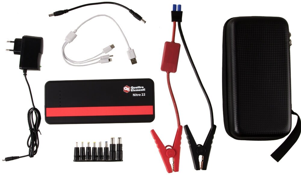 Пусковое устройство QUATTRO ELEMENTI Nitro 22 790-342 применяется для экстренного запуска автомобиля, лодки, мотоцикла и грузовика, а также для зарядки телефона, планшета, ноутбука и других электронных девайсов за счет встроенного источника питания.
