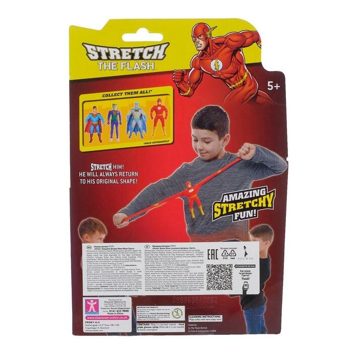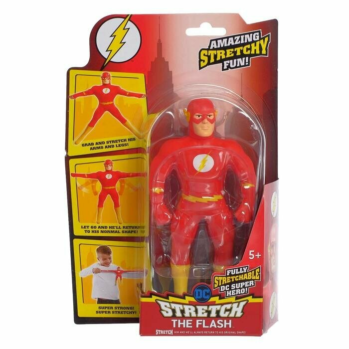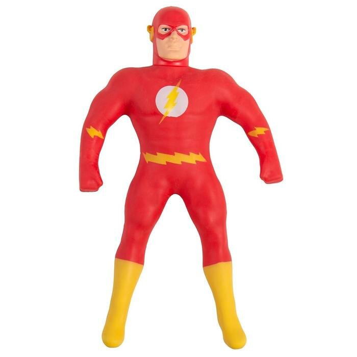 Фигурка Мини-Флэш Стрэтч в ярко-красном фирменном костюме с логотипом на груди, красной маске на голове и в желтых высоких ботинках. С этой игрушкой можно делать все, что угодно, она всегда будет принимать первоначальный вид.