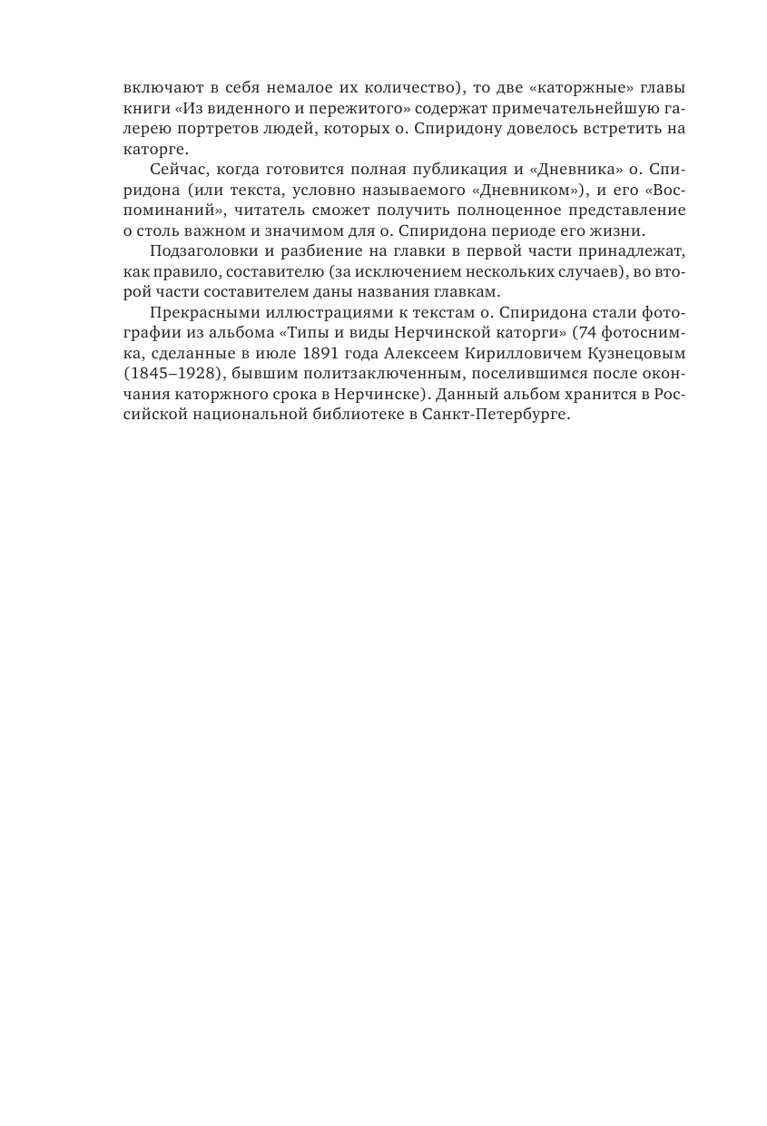 Хочу подчеркнуть, что известное произведение о. Спиридона «Из виденного и пережитого» входит в эту книгу! Не понимаю, как читал книгу автор другого отзыва, рекомендующий читать не «Нерчинскую каторгу», а «Из виденного и пережитого»… Вдобавок в книге много впервые изданных текстов.