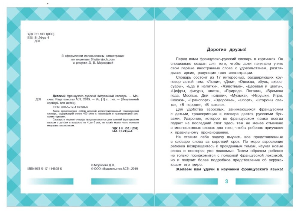 Словарь в первую очередь предназначается для занятий французским языком с детьми в возрасте от 4 до 6 лет, но также может быть полезен младшим школьникам.