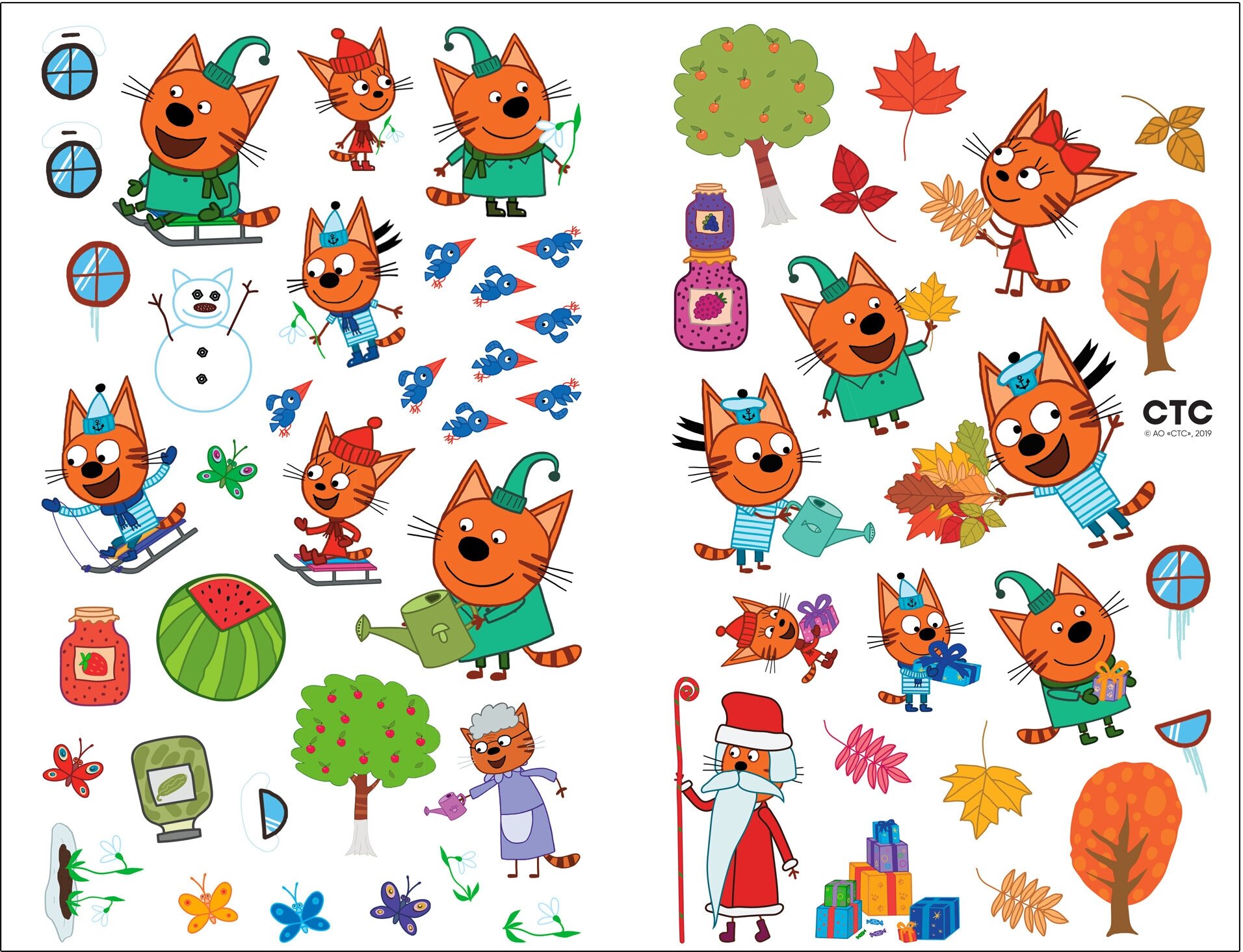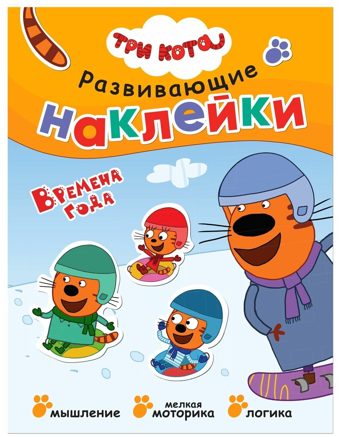 .Благодаря удобному формату заниматься по книге «Времена года» из серии «Три кота. Развивающие наклейки» можно где угодно: дома, в поездке, гостях и на прогулке.
