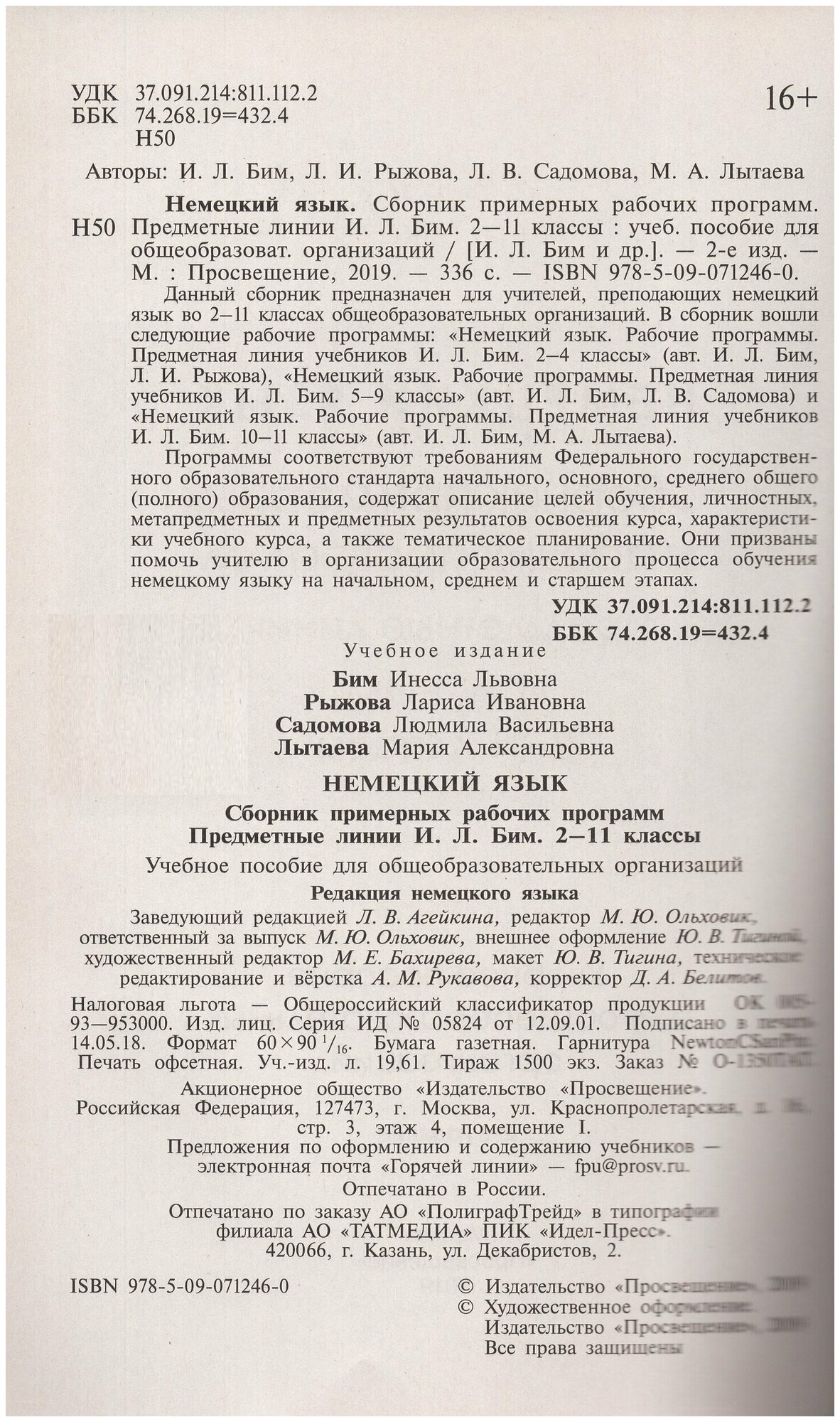 Немецкий язык. Сборник примерных рабочих программ. Предметная линия учебников И. Л. Бим. 2-11 классы (Бим Инесса Львовна, Лытаева Мария Александровна, Садомова Людмила Васильевна, Рыжова Лариса Ивановна); Просвещение, 2019