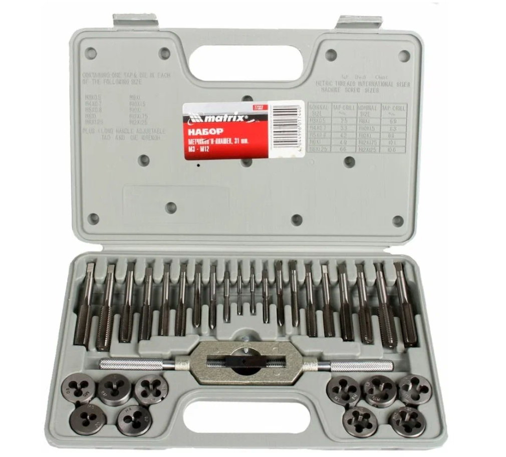 Набор метчиков и плашек М3-М12 Matrix из 31 предмета позволяет нарезать наружную и внутреннюю резьбу на металлических деталях. Также он применяется для восстановления сорванной резьбы. Все инструменты хранятся в удобном пластиковом боксе. Набор предназначен для ремонтных работ, используется в профессиональной и бытовой сфере.