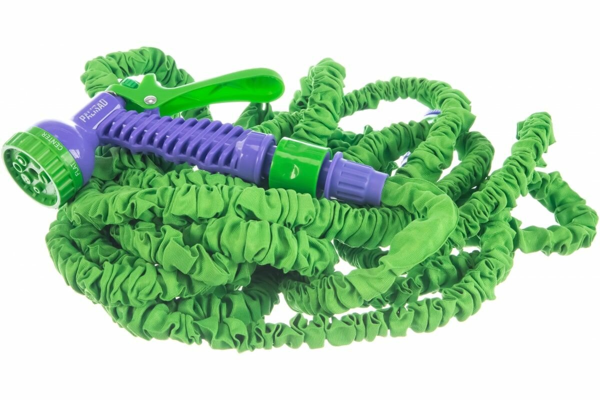 **Шланг растягивающийся усиленный с пистолетом** из двуслойного латекса и покрытием из полиэфирного волокна обладает повышенной прочностью. В собранном состоянии занимает всего 5 м, а весит 700 г, поэтому его удобно хранить в кладовке или перевозить в багажнике. Под давлением воды растягивается до 20 м. Пистолет из долговечного ABS-пластика имеет регулируемое сопло с 7 режимами орошения.
