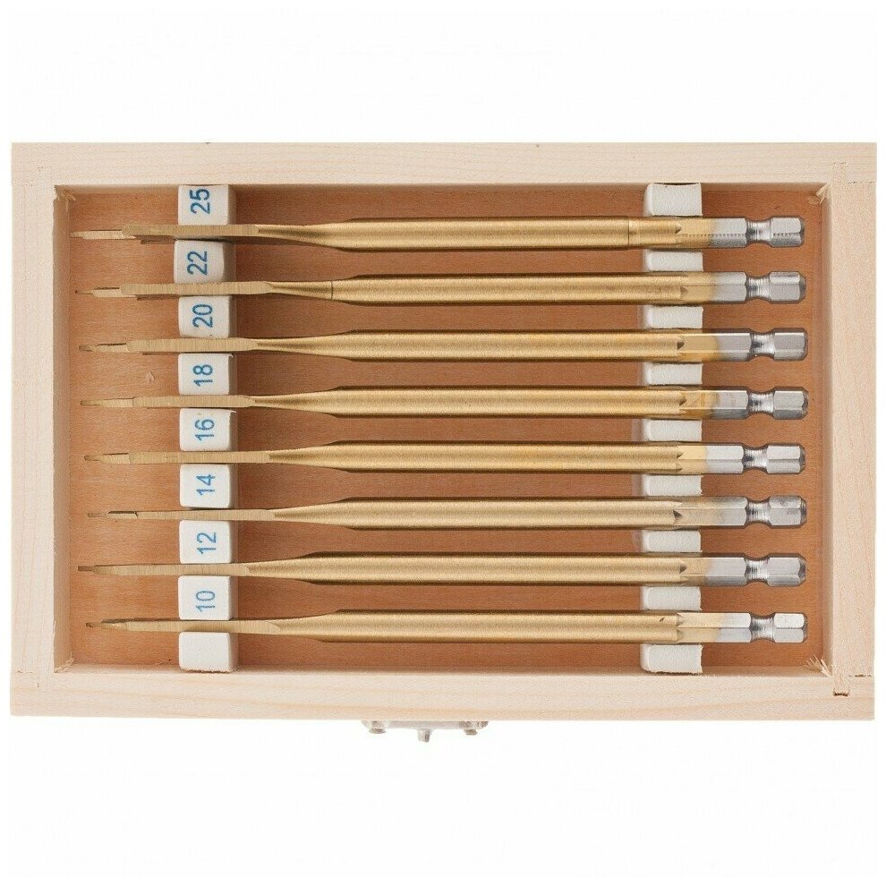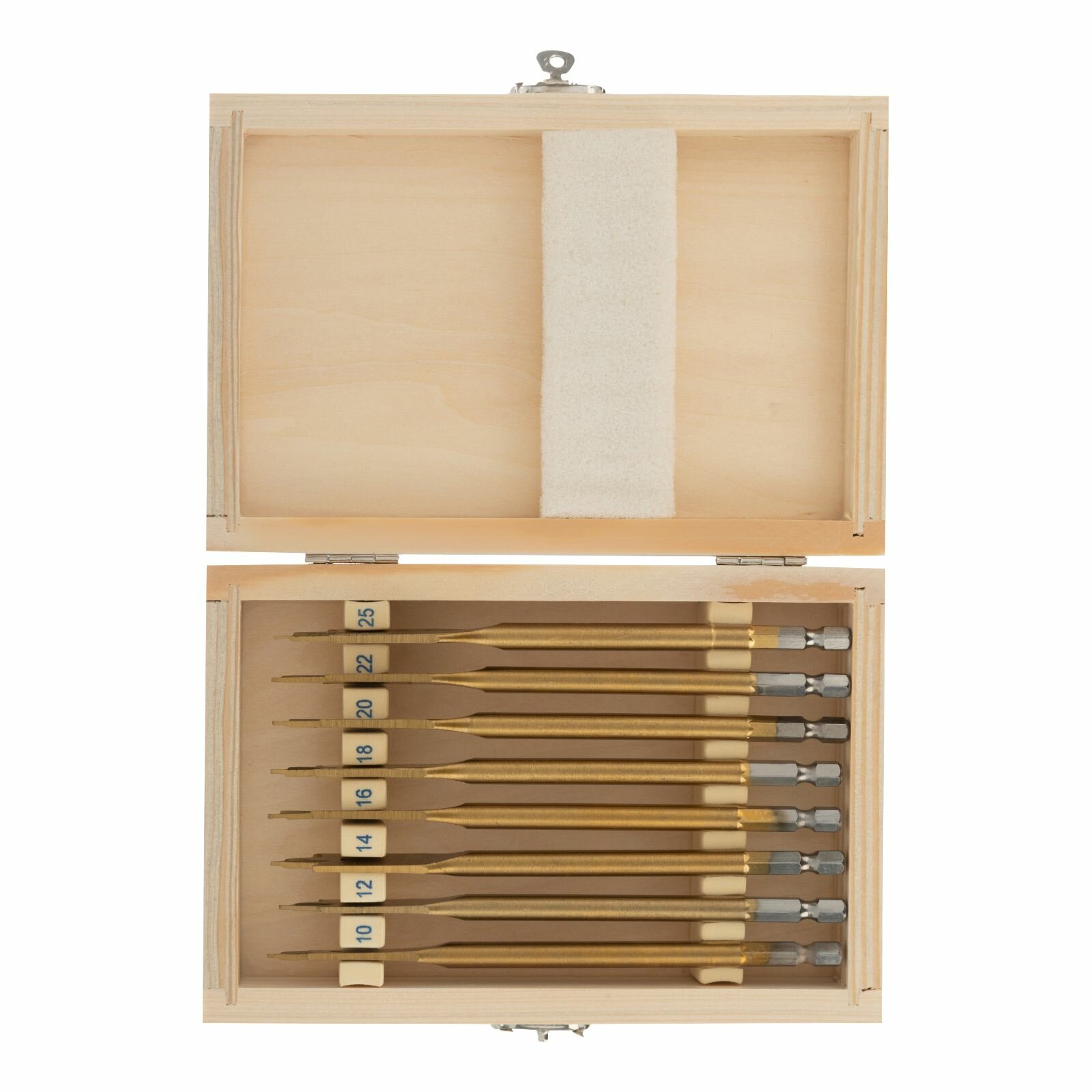 | Прочие особенности и свойства | Предназначены для сверления отверстий в древесине., Перовые сверла изготовлены из углеродистой стали., Твердость режущих кромок 45–54 HRC., Хвостовики имеют шестигранную форму, что предотвращает поворот сверла., Особенности набора:, , Наличие подрезных кромок, которые позволяют получать отверстия с улучшенным качеством поверхности. , Сверла имеют нитрид титановое покрытие, что повышает износостойкость и долговечность инструмента., Удобный деревянный кейс для хранения. |