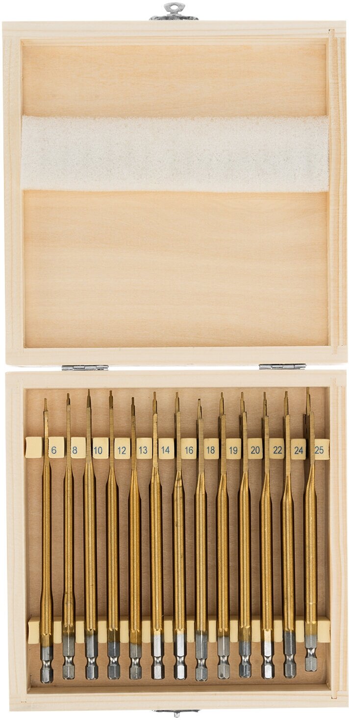 | Прочие особенности и свойства | Наличие подрезных кромок, которые позволяют получать отверстия с улучшенным качеством поверхности. , Сверла имеют нитрид-титановое покрытие, что повышает износостойкость и долговечность инструмента., Удобный деревянный кейс для хранения. |
