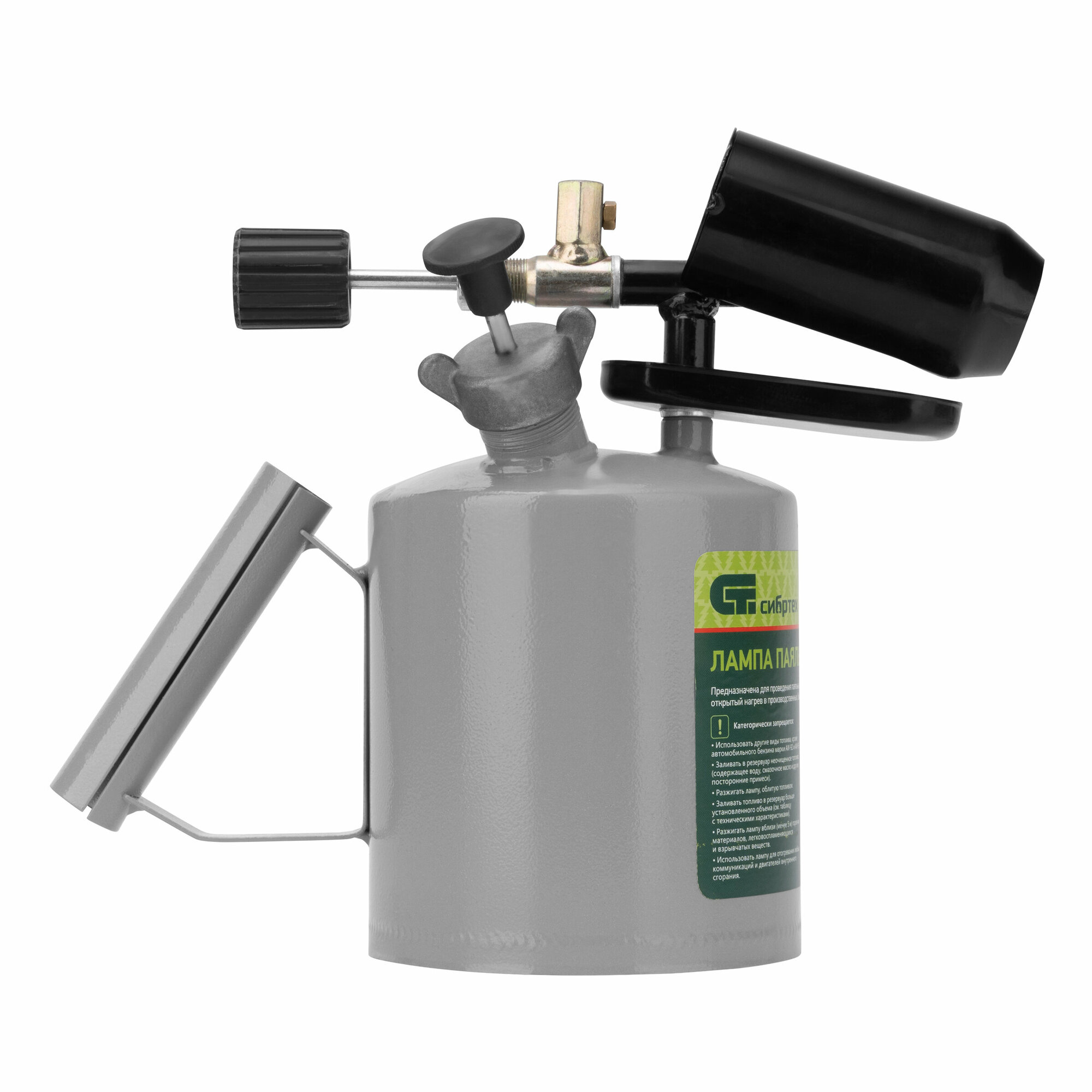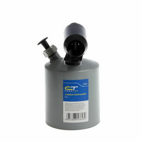 Паяльная лампа ''Сибртех '' с баком объемом 1,5 л используется для нагрева поверхностей. Она применяется для монтажных и демонтажных работ, полезна также и для решения бытовых задач. Паяльной лампой можно разогревать жало паяльника и припой, варить медные трубы, нагревать заржавевшие или замерзшие соединения, снимать лакокрасочные покрытия, устанавливать термоусадочные трубки, а при наличии специальной подставки лампа поможет даже приготовить пищу. Устройство работает на любом бензине, кроме этилированного, а значит, проблем с заправкой не будет - достаточно заехать на АЗС.