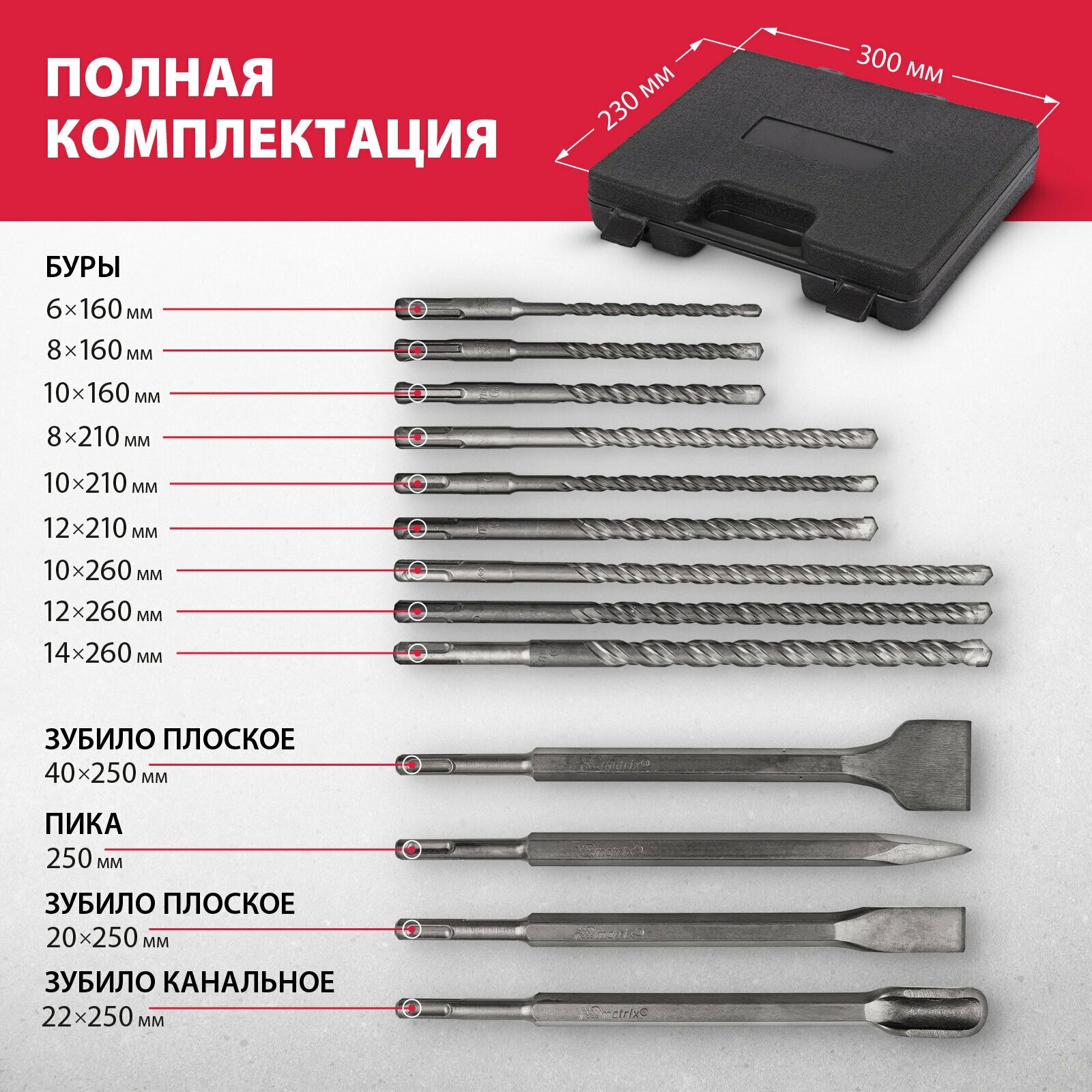| Комплект поставки | Буры по бетону 6-8-10х160 мм, 8-10-12х210 мм, 10-12-14х260 мм; Зубила - 4 шт |
