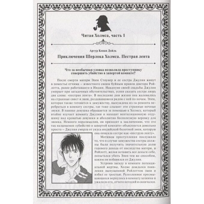 Книга - манга, т.е. читать страницы нужно справа налево. Все три книги пересказанные рассказы о Шерлоке Холмсе. Брала дочке, читать она не очень любит, а тут все три книги осилила за два дня. Внутри книги рисунки чёрно-белый. На мой взгляд, это достойный способ привлечь детей к чтению.