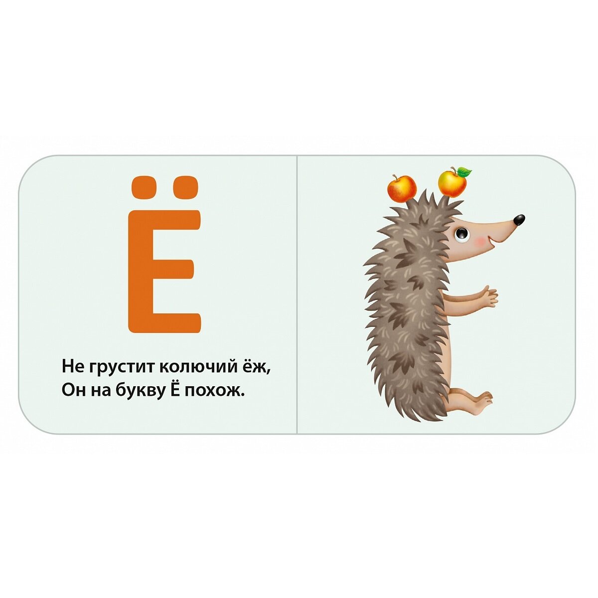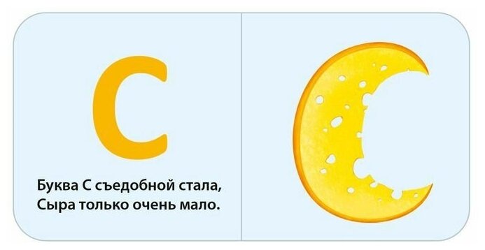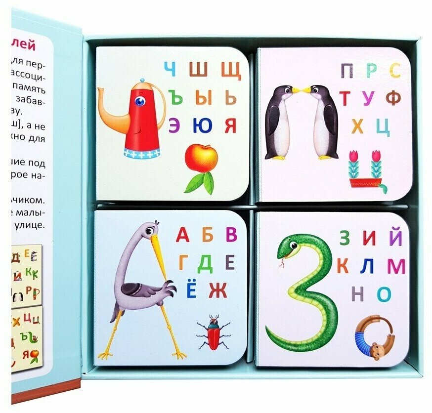 Внутри вы найдете 4 книжки-кубика с крупными буквами, забавной картинкой-ассоциацией, внешне напоминающей эту букву, а также весёлое двустишие Евгения Сосновского к соответствующей букве!