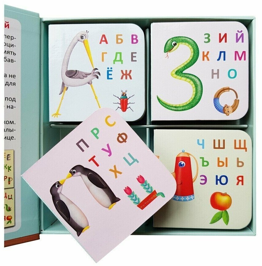 Алфавит для самых маленьких. В комплект входит четыре небольших книги-кубика в аккуратной коробке. Книги идеально помещаются в маленьких ручках ребёнка, страницы очень толстые (не порвутся и не помнутся), удобно переворачивать. На каждом развороте небольшое стихотворение о букве и симпатичное изображение этой буквы в виде какого-нибудь зверя, предмета и прочее.